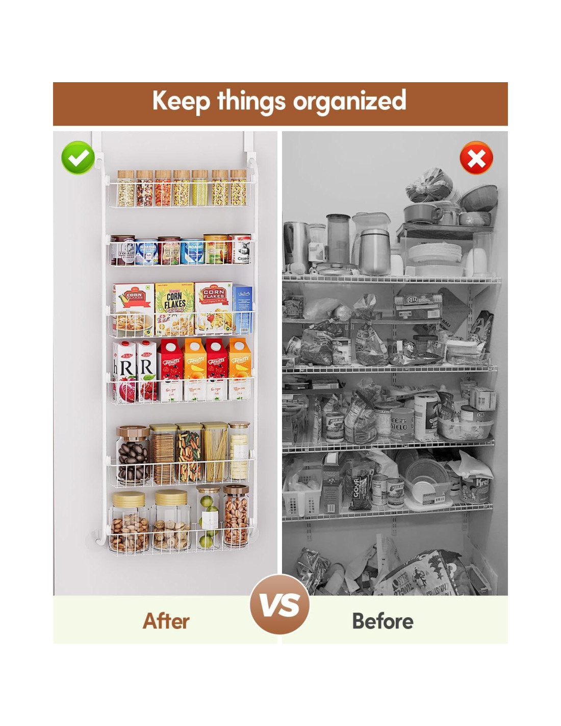 - Materiales duraderos y de alta calidad: Hecho de acero de alta calidad con un recubrimiento en polvo resistente a la corrosión, este organizador de despensa sobre la puerta está construido para durar. Varillas de soporte reforzadas mejoran la durabilidad, previniendo la flexión, deformación o rotura, asegurando una fuerte capacidad de carga.