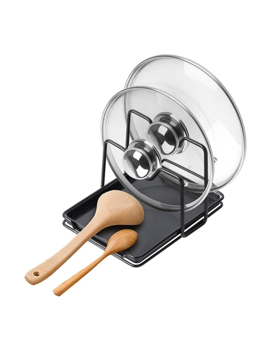 - Diseño único 2 en 1 - El estante en forma de U, simple y elegante, puede fijar verticalmente las tapas de olla, las tapas no se caerán fácilmente; También puedes poner otros utensilios de cocina en la bandeja de drenaje para ahorrar espacio y mantener todo ordenado.