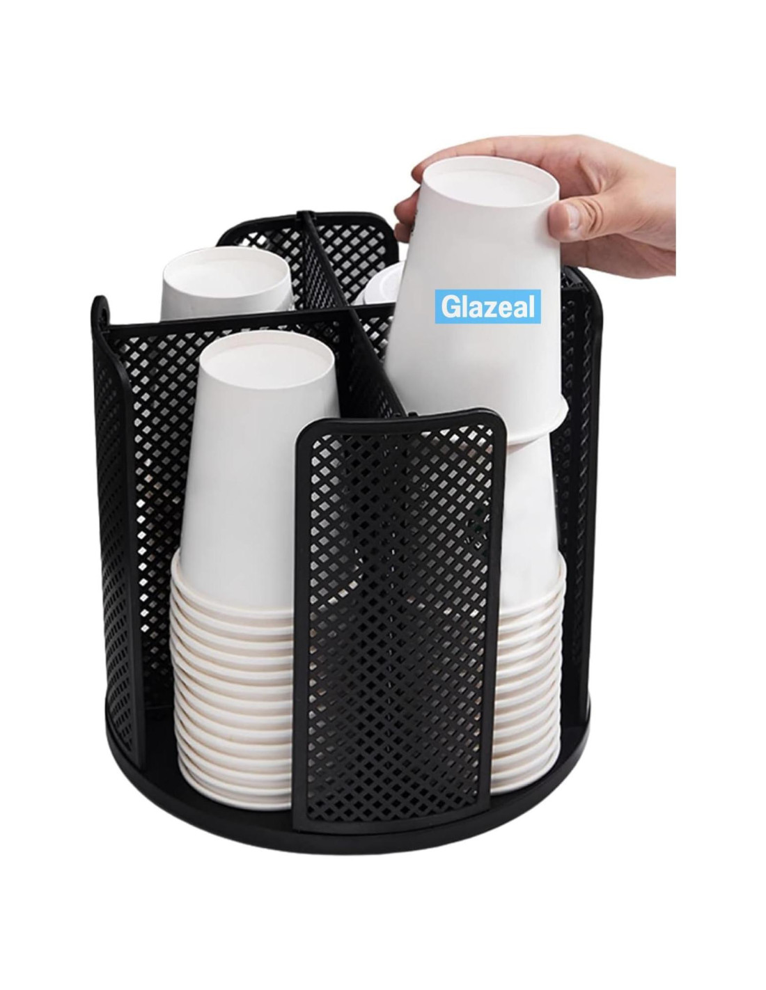 - GRAN CAPACIDAD DE ALMACENAMIENTO: Nuestro Organizador de Tazas y Tapas Rotatorio mide 9.25 x 9.25 x 8.66 pulgadas (23,5 x 23,5 x 22 cm) y cuenta con cuatro compartimentos que pueden contener hasta 80 tazas. Cada compartimento puede acomodar tazas de 5 oz a 16 oz y sus tapas correspondientes, lo que lo convierte en una solución de almacenamiento conveniente.