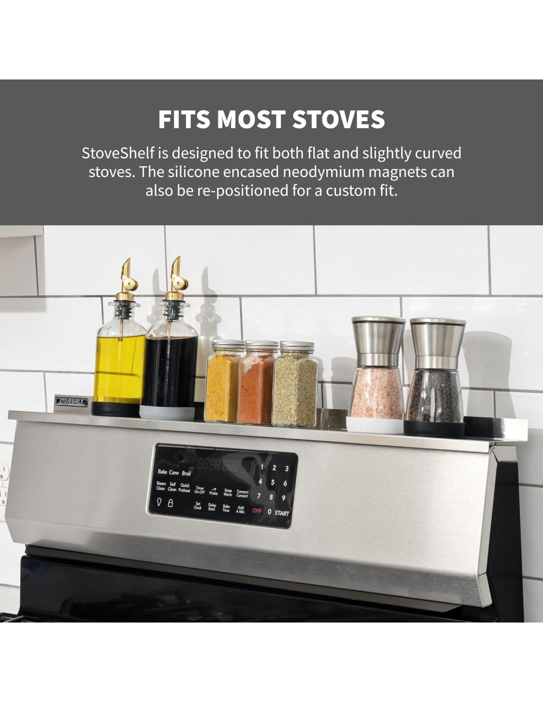 - SEGURO POR MAGNETOS: StoveShelf está equipado con dos imanes de neodimio recubiertos de silicona que lo mantienen firmemente sujeto mientras protegen el acabado original de tu estufa. Para asegurar la compatibilidad antes de la compra, utiliza cualquier imán doméstico y colócalo a lo largo del panel superior de tu estufa para verificar la magnetización.
