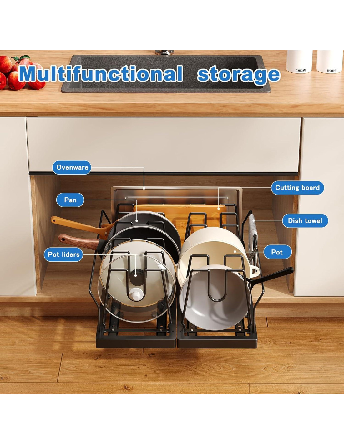 - Gran Capacidad y Divisores Ajustables: El organizador de ollas y sartenes bajo el gabinete mide 21.65" (54.86 cm) D*7.87" (19.99 cm) W*8.66" (21.96 cm) H, que contiene 10 divisores en forma de U ajustables, y puede sostener al menos 9 artículos, como ollas, sartenes, tablas de cortar, tapas, etc. Las barandillas laterales también pueden colgar paños de cocina, proporcionando una gran capacidad de almacenamiento, aprovechando al máximo el espacio de su gabinete, fácil acceso y eliminando el desorden, proporcionando un ambiente de cocina limpio y ordenado.