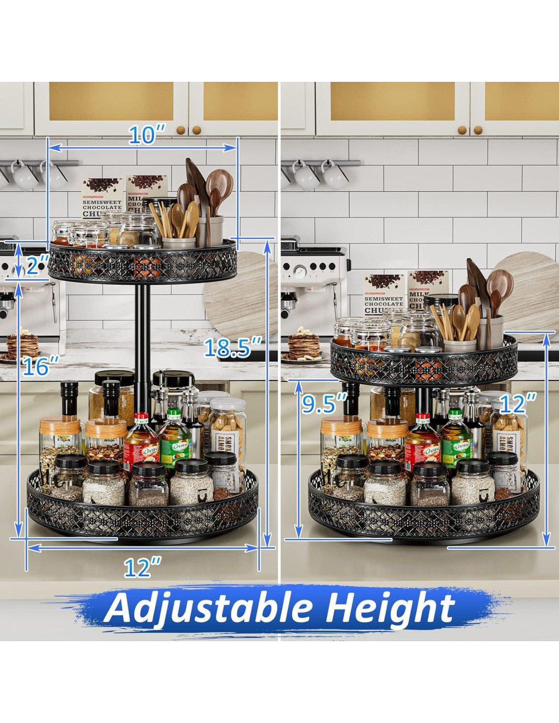 - Lazy Susan Ajustable en Altura: Este organizador lazy susan de 2 niveles con altura ajustable de 8 pulgadas (20,32 cm) a 16 pulgadas (40,64 cm) según lo necesites, que puede adaptarse perfectamente a botellas, especias y bocadillos de diferentes alturas. El diseño de 2 niveles proporciona más capacidad de almacenamiento, aprovechando al máximo el espacio limitado en tu hogar para mantener las cosas ordenadas y organizadas.