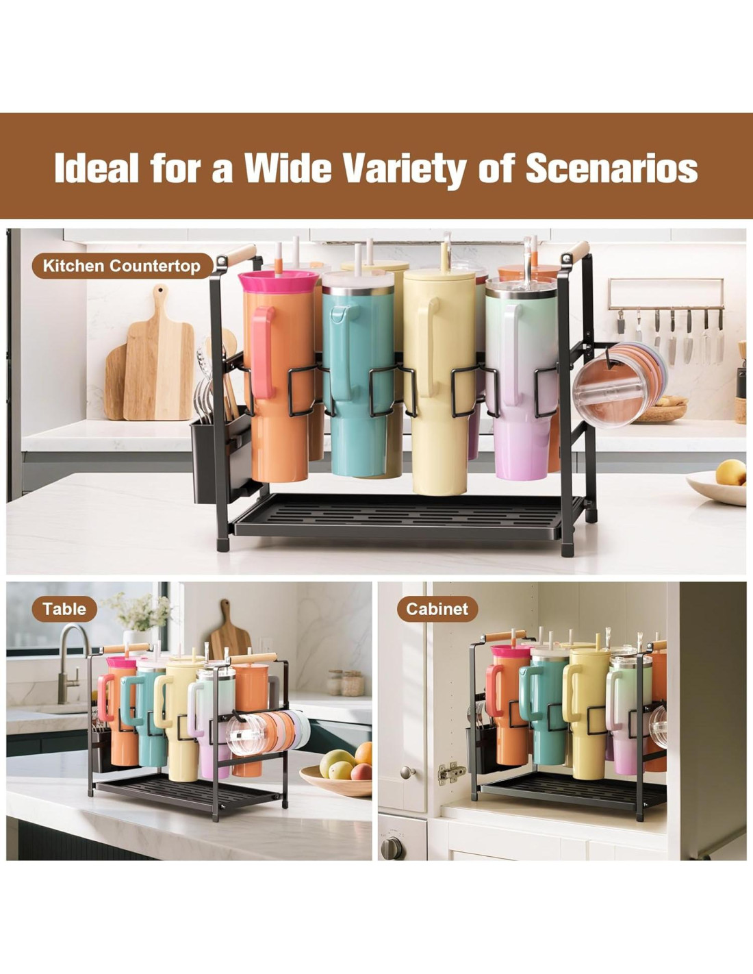 - Almacenamiento Ideal para Tazas: Diseñado para tumblers de 40 oz con mango, este organizador de tazas Stanley puede contener hasta 8 botellas. El organizador de almacenamiento de tazas cuenta con ganchos dedicados para tapas. Ideal para colocarse en encimeras de cocina, mesas de comedor o escritorios de oficina, el organizador de botellas de agua ayuda a organizar tu espacio, haciendo que el soporte para tumbler sea perfecto para uso familiar o reuniones.