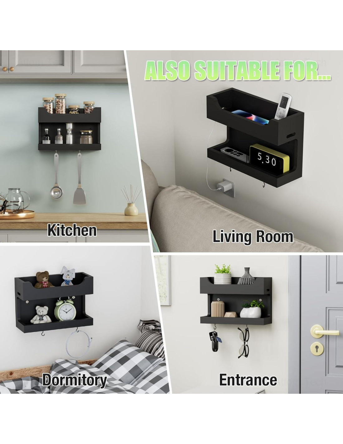 - [Estante de Almacenamiento de Pared Doble Capa Compacto] Con dimensiones de 25.1 x 9 x 17 cm, este estante está diseñado para almacenar de manera eficiente elementos esenciales diarios como teléfonos móviles, relojes, controles remotos, controladores de juegos, gafas, auriculares Bluetooth, llaves y más. La capa superior cuenta con agujeros para cables a cada lado, permitiendo la carga conveniente de dispositivos electrónicos. Ideal para mantener tus objetos personales organizados y accesibles.