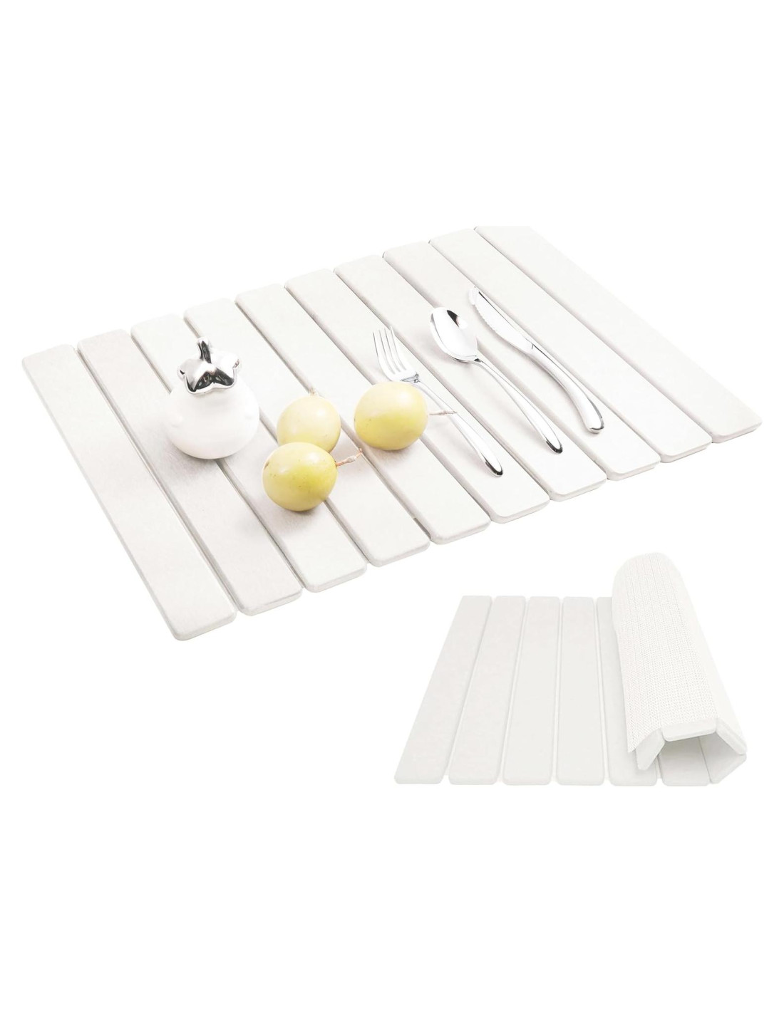 - Plegable y Ahorra Espacio: La gran alfombrilla de secado de piedra te da la libertad de personalizar tu espacio de secado. Plegala en diferentes formas o tamaños para adaptarse a tu encimera, o crea secciones separadas para platos, utensilios y ollas. Se ajusta perfectamente en cajones o armarios, ofreciendo una excelente solución para ahorrar espacio en cualquier hogar.