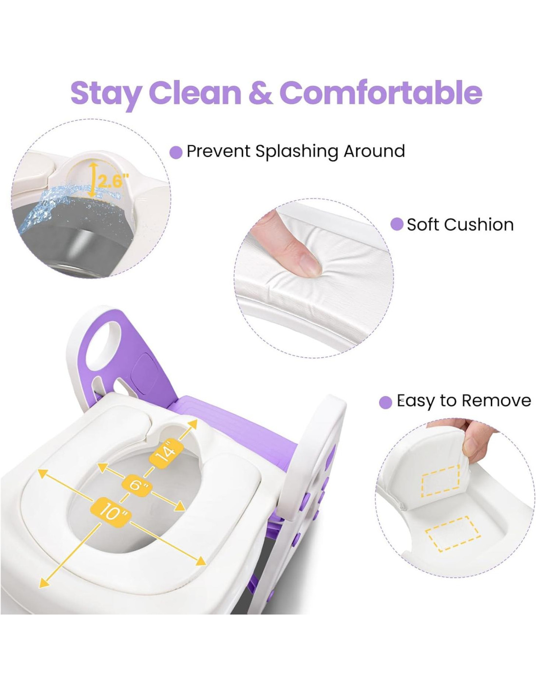 - Diseño de Detalles: El cojín suave es removible sin ninguna curva o hendidura difícil de alcanzar. El protector contra salpicaduras evita que la orina de los niños salga disparada. El asa es un plus para escalar fácilmente