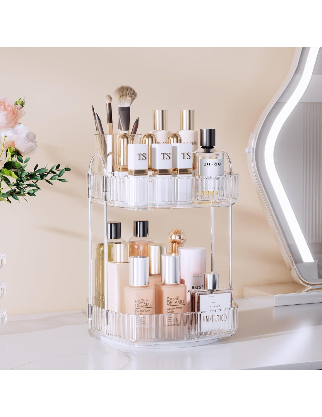 - Gran Capacidad para Almacenamiento Vertical - Gran Capacidad para suficiente espacio vertical. 2 Niveles 12.20" (31 cm) de Altura y 3 Niveles 18.11" (46 cm) de Altura, este organizador de baño rotativo tiene amplio espacio para almacenar perfume, lápiz labial, sombra de ojos, cuidados de la piel. El organizador giratorio transparente además, 1.97" (5 cm) de barandilla elevada protege los artículos de caerse.