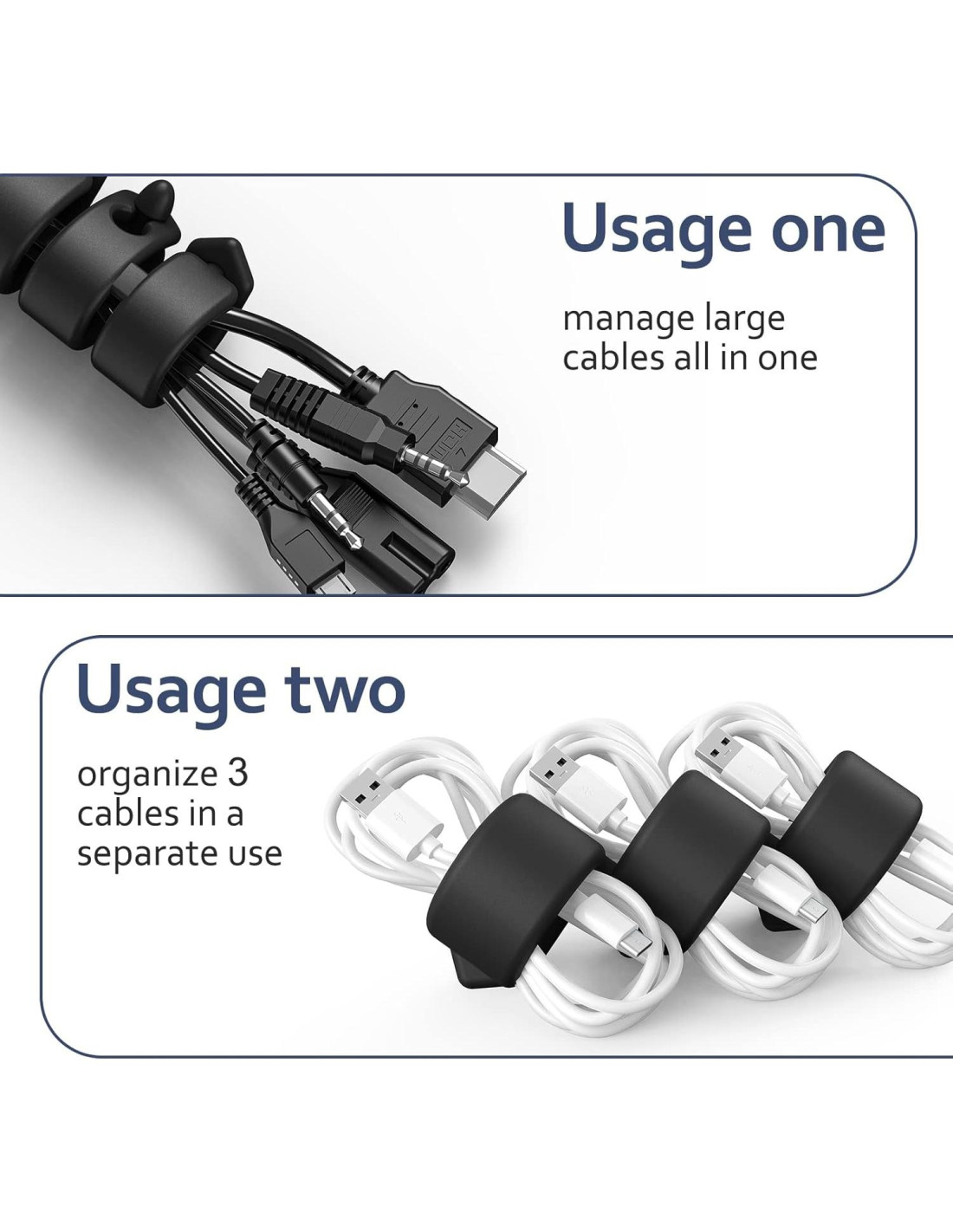 - Amplia aplicación: Al encajar en el pequeño agujero de una manera diferente, obtendrás 2 usos. Ya sea que se trate de cables grandes o pequeños, puedes organizarlos y protegerlos fácilmente.