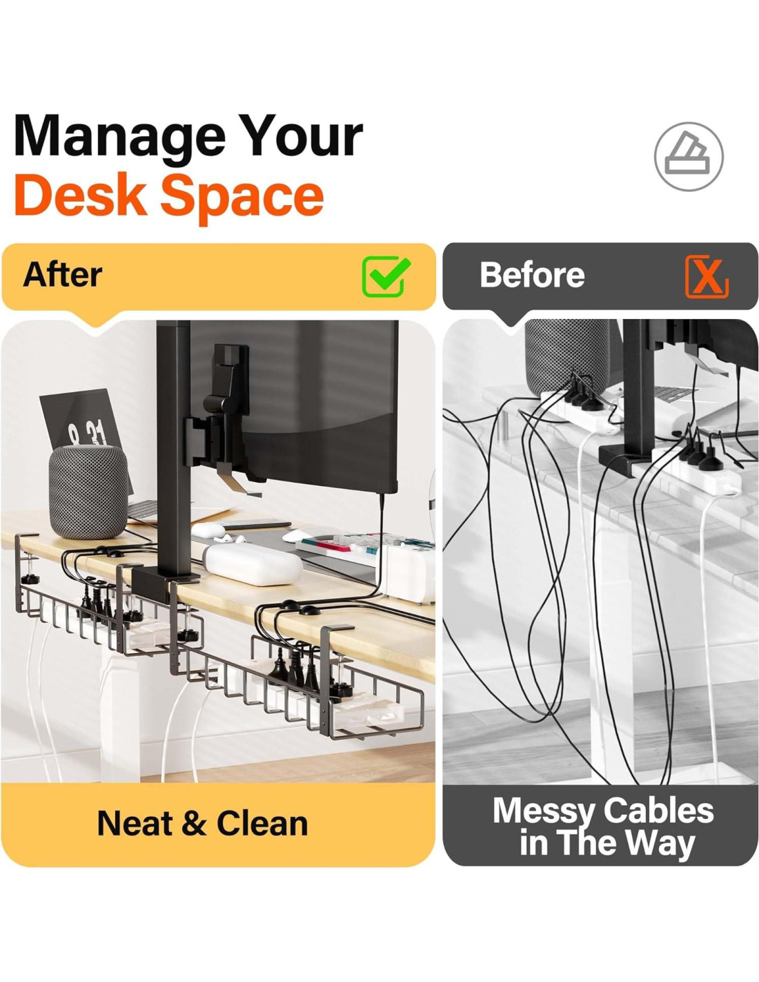 - Ahorra Espacio de Almacenamiento El diseño curvado hueco de la bandeja de gestión de cables debajo del escritorio puede organizar cualquier cable de datos, cables de alimentación, regletas de enchufes fuera del suelo. Dándote una gestión total de cables debajo del escritorio. No más desorden y no más cables colgantes o enredados. No solo puedes ocultar los cables de tus pies, sino que también puedes poner suministros de oficina en ellos para mantener tus escritorios y suelos limpios y ordenados.