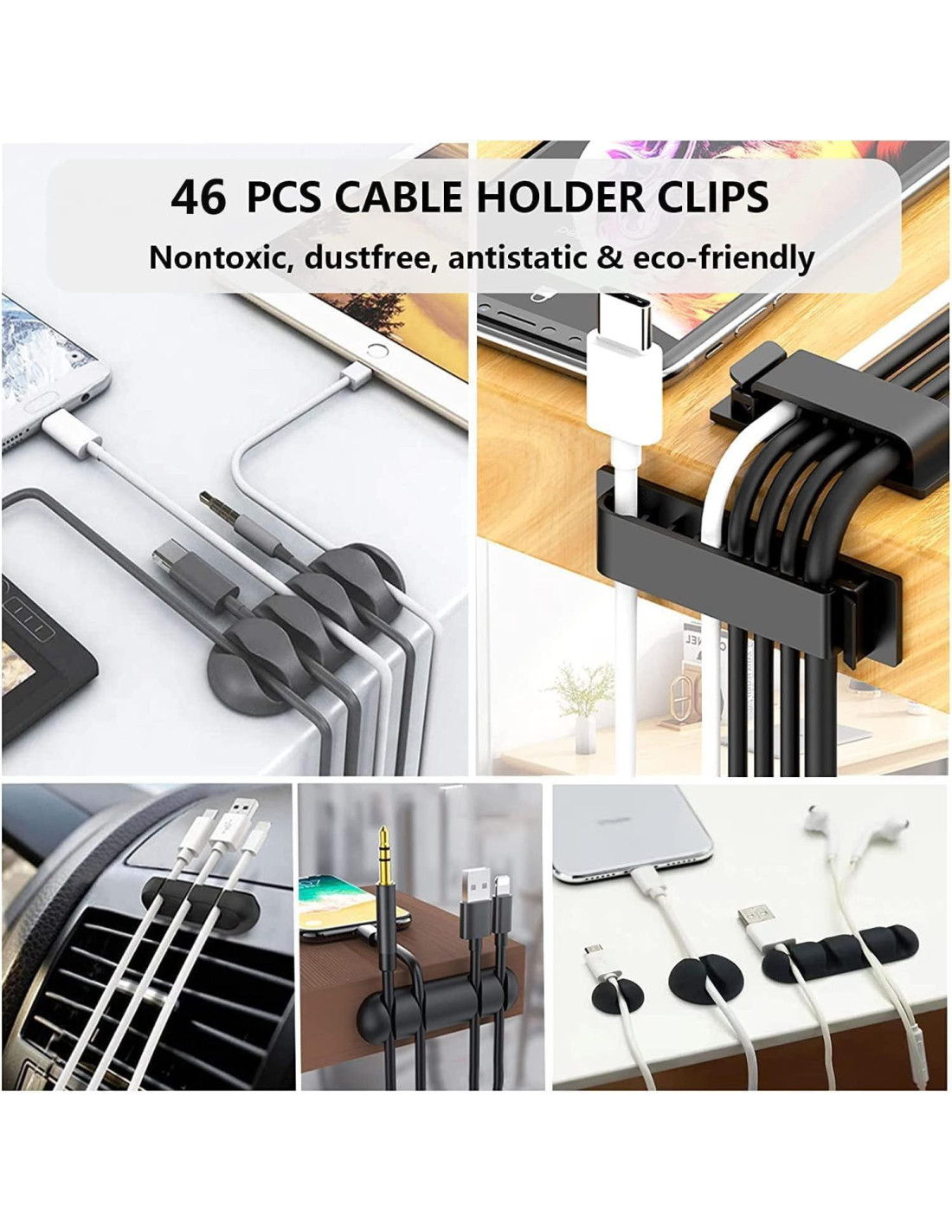 - 3 tipos de Clips de Cable Negros: 36 clips de cable están hechos de material de Poliamida66, no tóxico, extra fuerte. Funciona en todas las superficies limpias como escritorios, paredes, zócalos, gabinetes, madera, cerámica, etc. Dos colores (negro transparente) satisfacen bien tus necesidades