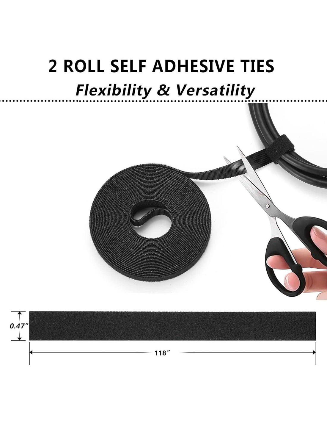 - Kit de Organización de Cables: Este kit completo incluye una variedad de soluciones que incluyen 4 protectores de cables (50.8 cm l x 10.16 cm w), 10 ataduras reutilizables, 36 soportes de cables adhesivos negros, 2 rollos de ataduras adhesivas (la longitud de cada rollo es 500.3 cm), 100 ataduras de nylon (tamaño de cada una: 20.1 cm L x 0.3 cm w)