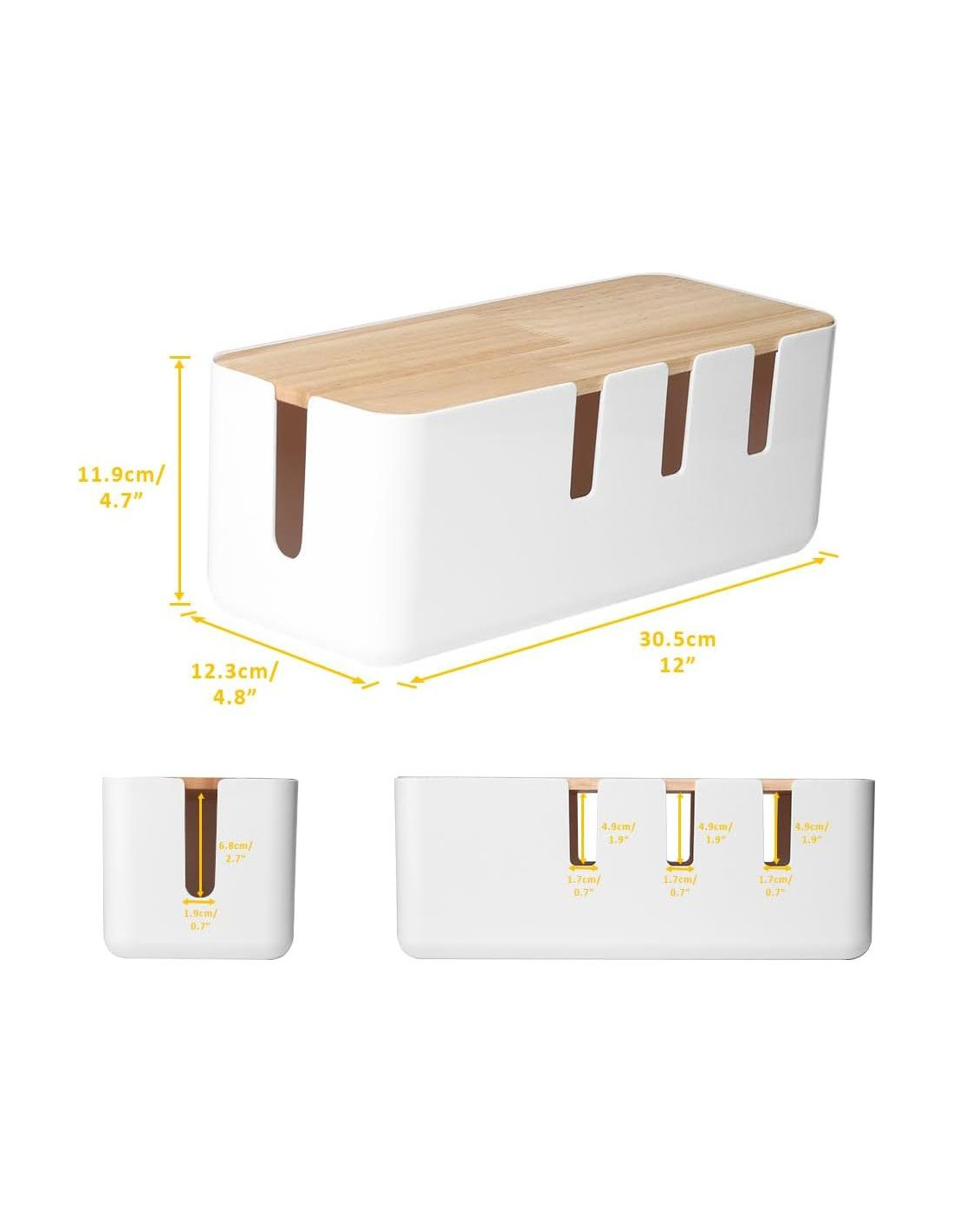 - Almacenamiento Espacioso y Versátil: Con unas medidas de 12" x 5" x 4.5" (30,48 x 12,7 x 11,43 cm), esta caja acomoda regletas de hasta 11.4 pulgadas (29 cm) de largo y 4.1 pulgadas (10,41 cm) de ancho, proporcionando amplio espacio para todos tus cables, cargadores y dispositivos. Perfecta para usar en salas de estar, oficinas o incluso encimeras de cocina.