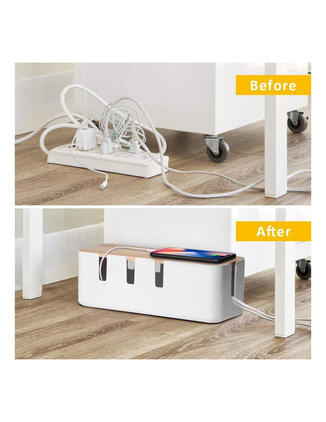 - Diseño Elegante y Funcional: Esta caja de gestión de cables cuenta con una tapa de madera elegante que se integra perfectamente con cualquier decoración del hogar u oficina, asegurando que tu espacio se vea ordenado y organizado mientras oculta eficazmente las antiestéticas regletas de alimentación y cables.