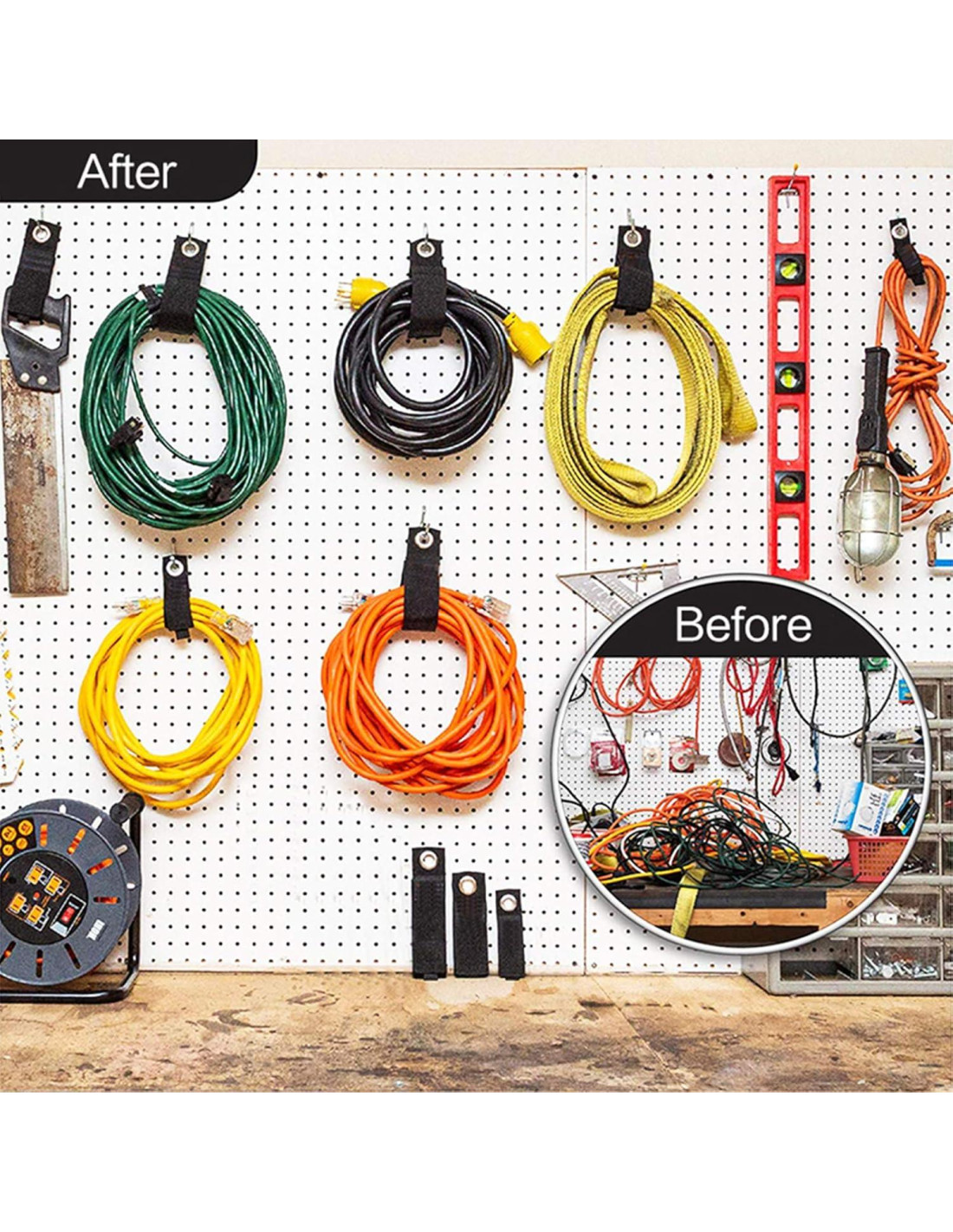 - AMPLIA GAMA DE USOS: El organizador de soporte para cables de extensión es versátil y se puede usar para una amplia gama de aplicaciones. Las correas de almacenamiento son fáciles de colgar cables de extensión, cables de electrodomésticos grandes, cables de red, cables de generador, cables de alimentación eléctrica y herramientas con cable. Además, los organizadores de cables eléctricos se pueden usar para organizar mangueras de lavadora, mangueras de jardín y piscina, mangueras de aire y aspiradoras, cuerdas y más