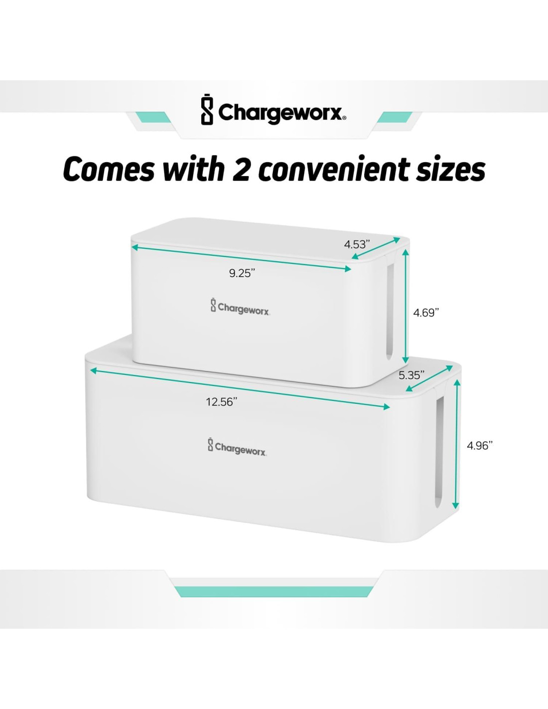 Nuestro diseño elegante y minimalista se integra perfectamente en cualquier entorno sin abrumar tu espacio. Con una marca discreta, nuestra caja de gestión de cables complementa tu espacio de trabajo, cocina y hogar sin robar protagonismo. Mantén a las mascotas, niños y aspiradoras robot alejados de los cables y alambres expuestos guardándolos de forma segura dentro de la caja de gestión de cables. Las cajas incluyen una tapa, proporcionando una capa extra de seguridad al conjunto. Ya sea para tu oficina en casa, consola de medios o suelo del dormitorio, nuestras cajas de gestión de cables son la herramienta de organización perfecta para cualquier entorno. Las tres aberturas convenientes aseguran flexibilidad en la colocación de las cajas de gestión de cables. Con unas generosas medidas de 30.48 cm de largo, 12.7 cm de ancho y 11.43 cm de alto, nuestra caja de gestión de cables proporciona amplio espacio para ocultar protectores de sobretensión y regletas grandes, asegurando que todos tus cables permanezcan organizados y fuera de la vista. Hecha de plástico reforzado resistente al calor de calidad, el set de Caja de Gestión de Cables ChargeWorx ha sido rigurosamente probado para asegurar que tus cables estén a salvo de sobrecalentamiento dentro de la caja. Las tres aberturas ayudan a ventilar el aire dentro de tu caja, manteniendo el calor afuera.