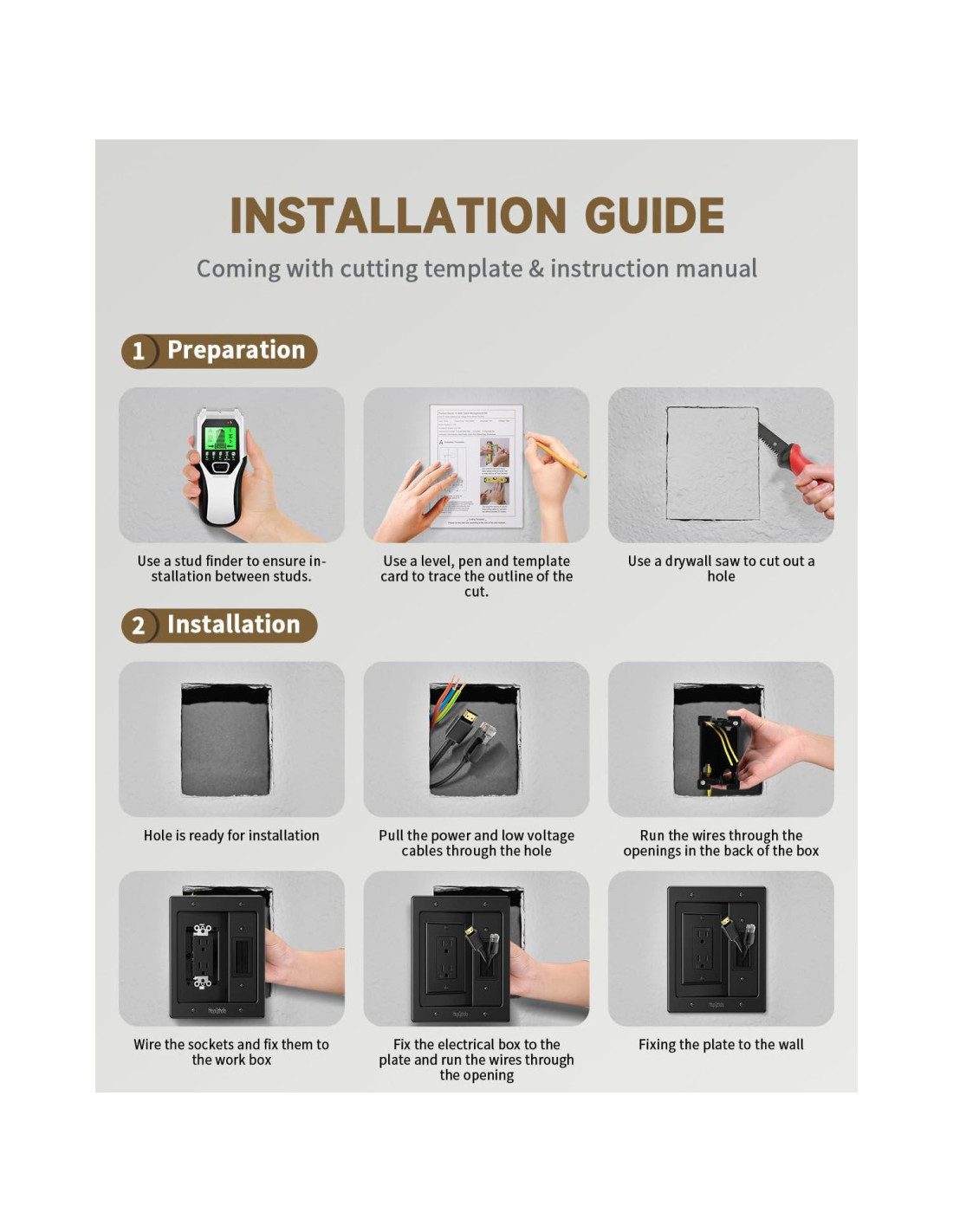 - Salida empotrada que ahorra espacio y ocultador de cables para TV. La salida empotrada se integra en las paredes como un ocultador de cables para TV montada en la pared, escondiendo los cables de alimentación y A/V/HDMI fuera de la vista. Su diseño de bajo perfil permite que las TVs y el equipo A/V se coloquen al ras, ahorrando espacio mientras oculta los cables sin esfuerzo.