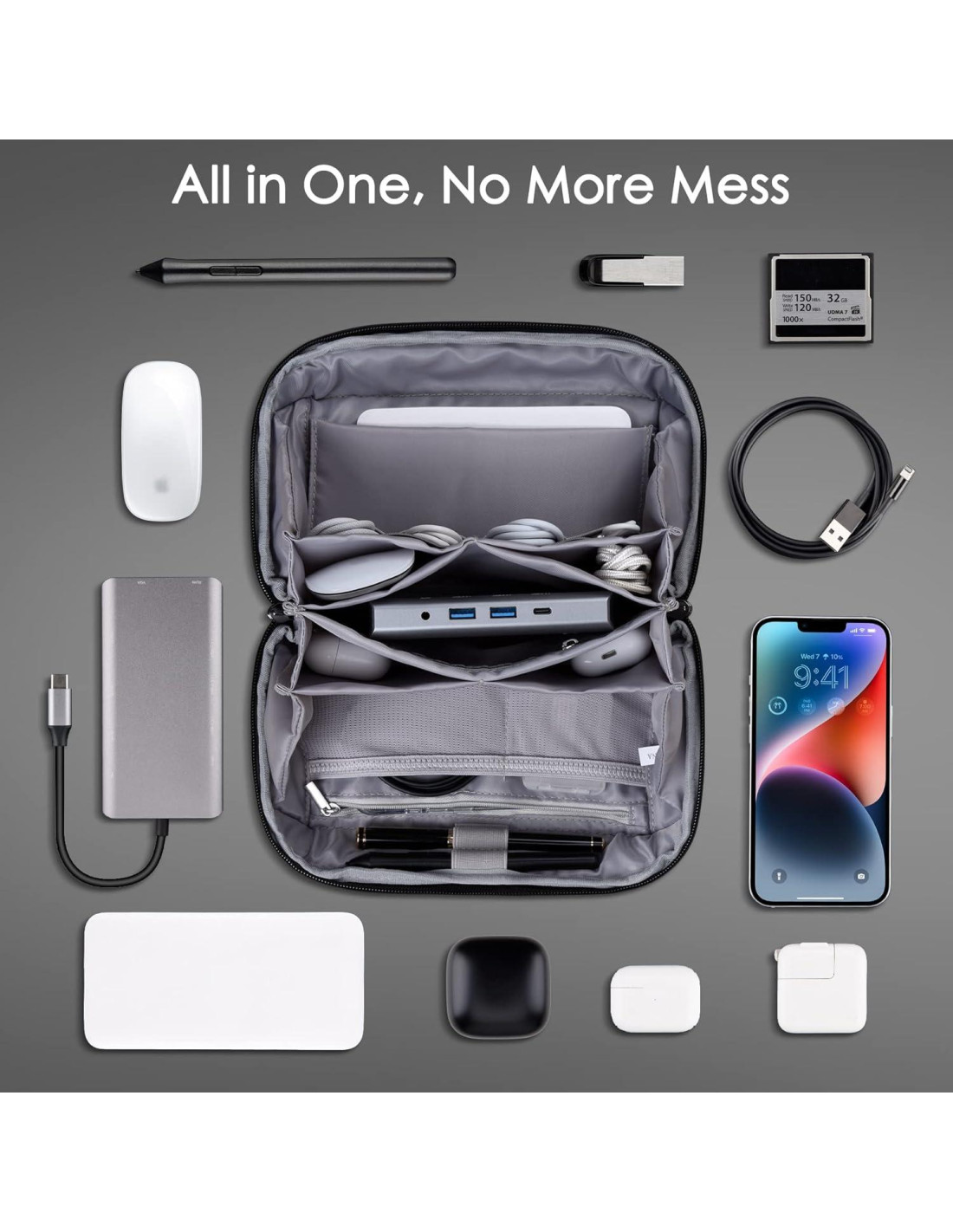 - Adquisición Rápida: Este estuche organizador de cargadores permite un fácil acceso a todos tus accesorios electrónicos sin derramar cosas