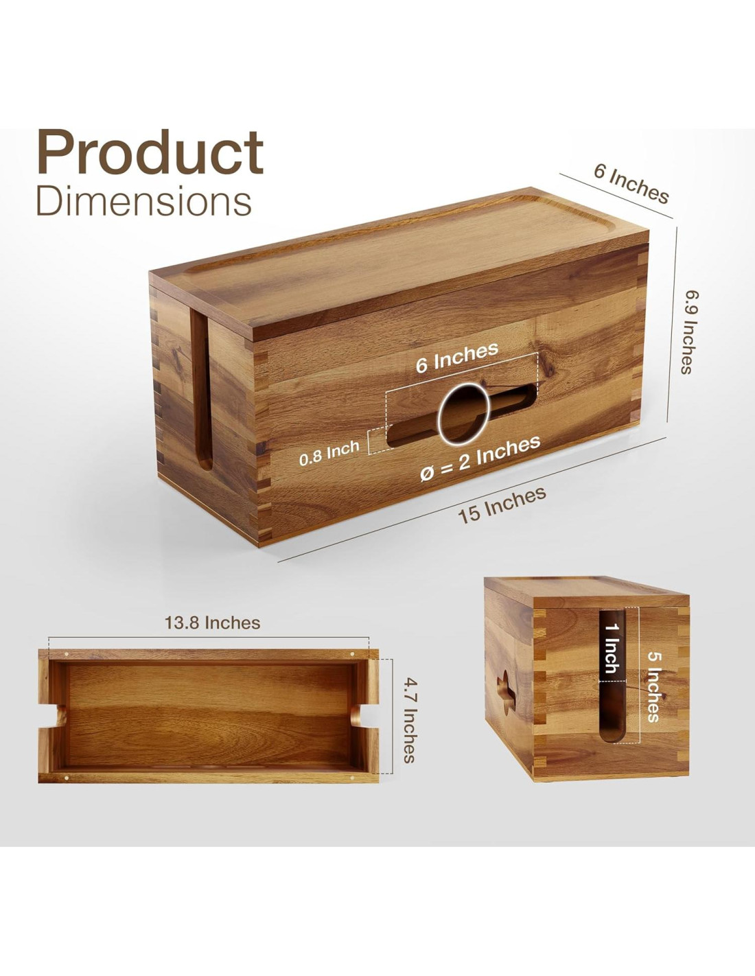 - Madera de Acacia de Alta Calidad: Fabricada con madera de acacia duradera y un acabado natural suave, esta caja de gestión de cables está diseñada para resistir el uso diario mientras añade sofisticación discreta a cualquier espacio. Su generoso tamaño de 15"L x 6"W x 6.9"H (38.1 cm x 15.2 cm x 17.5 cm) acomoda la mayoría de las regletas de poder, protectores contra sobretensiones y cables excedentes, manteniendo tu configuración ordenada sin ocupar espacio innecesario.