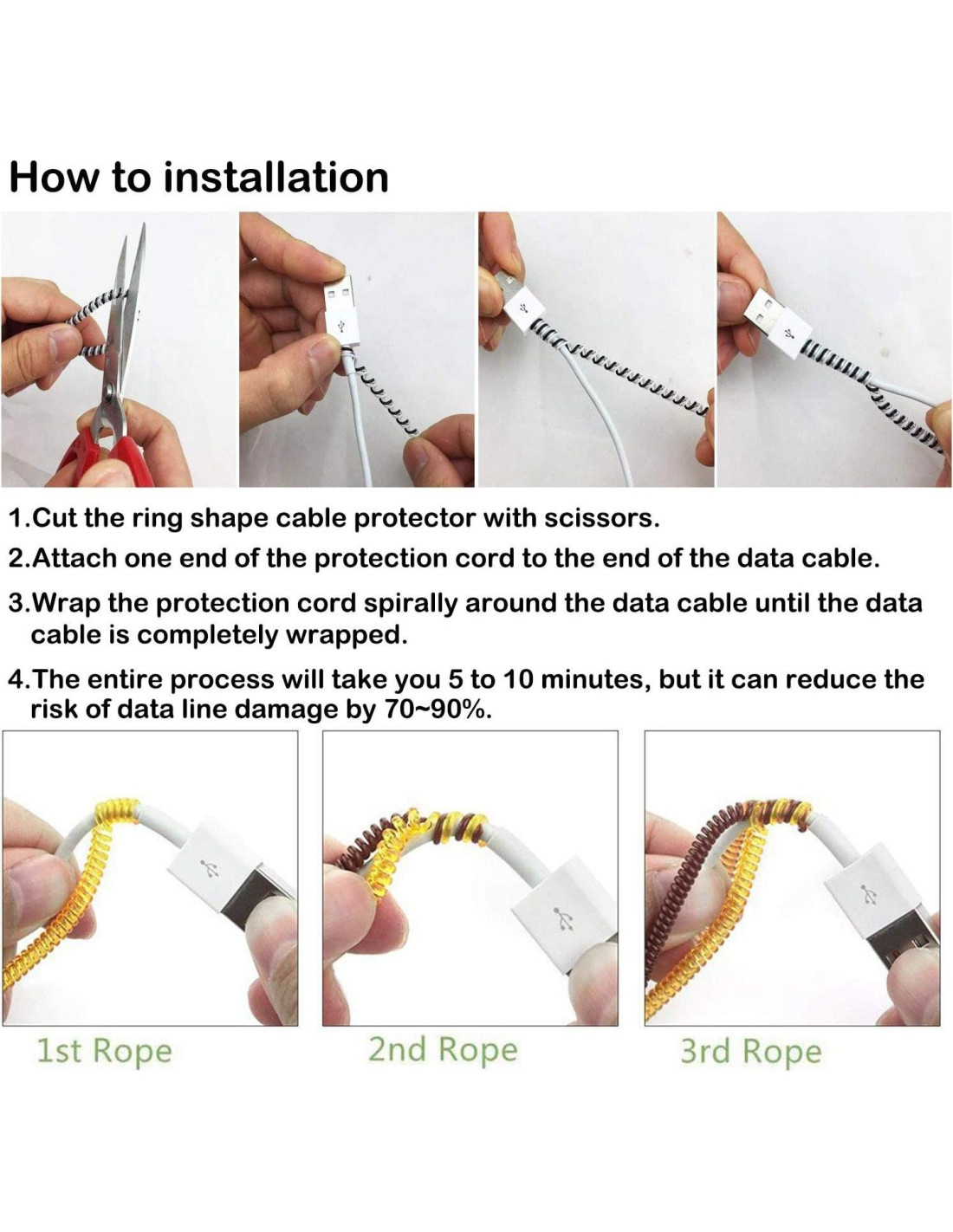- Nota: Necesitas envolver el protector de cable alrededor de la línea de datos, lo que puede llevarte más tiempo. Si no te gusta el bricolaje, por favor no lo compres