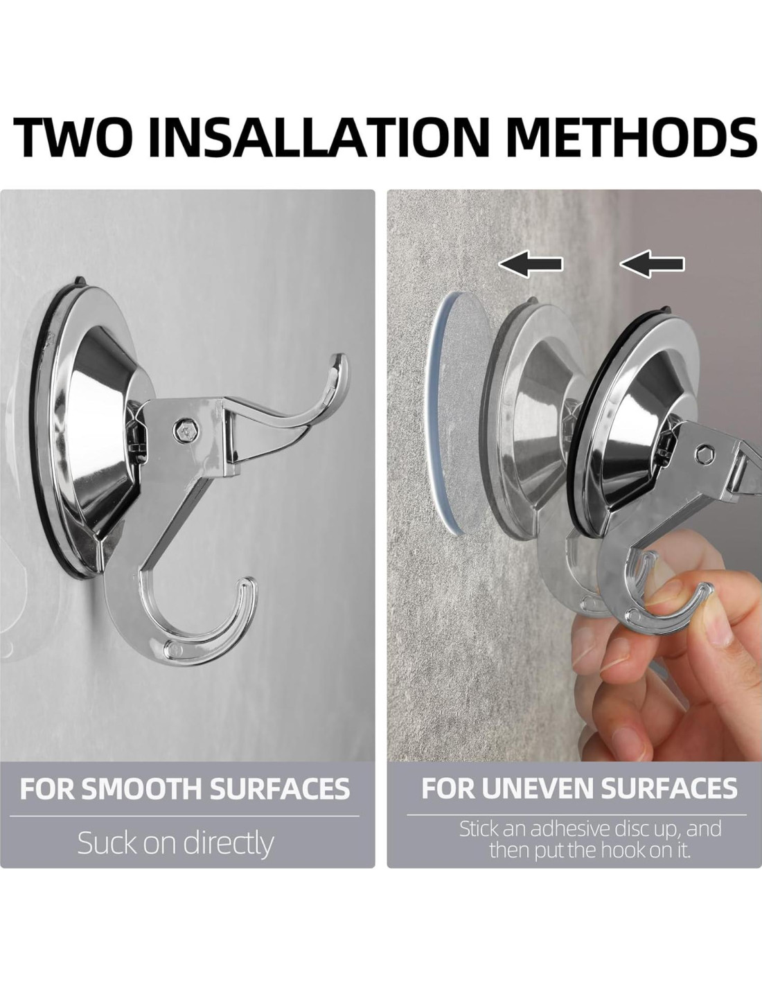 - Dos Métodos de Instalación Para superficies lisas, solo limpia y bloquea el gancho de la copa de succión. Para la instalación en superficies irregulares, puedes instalar los discos adhesivos incluidos (cada uno tiene solo 3.5 mm/0.14 pulgadas de grosor) y luego colocar el gancho encima.