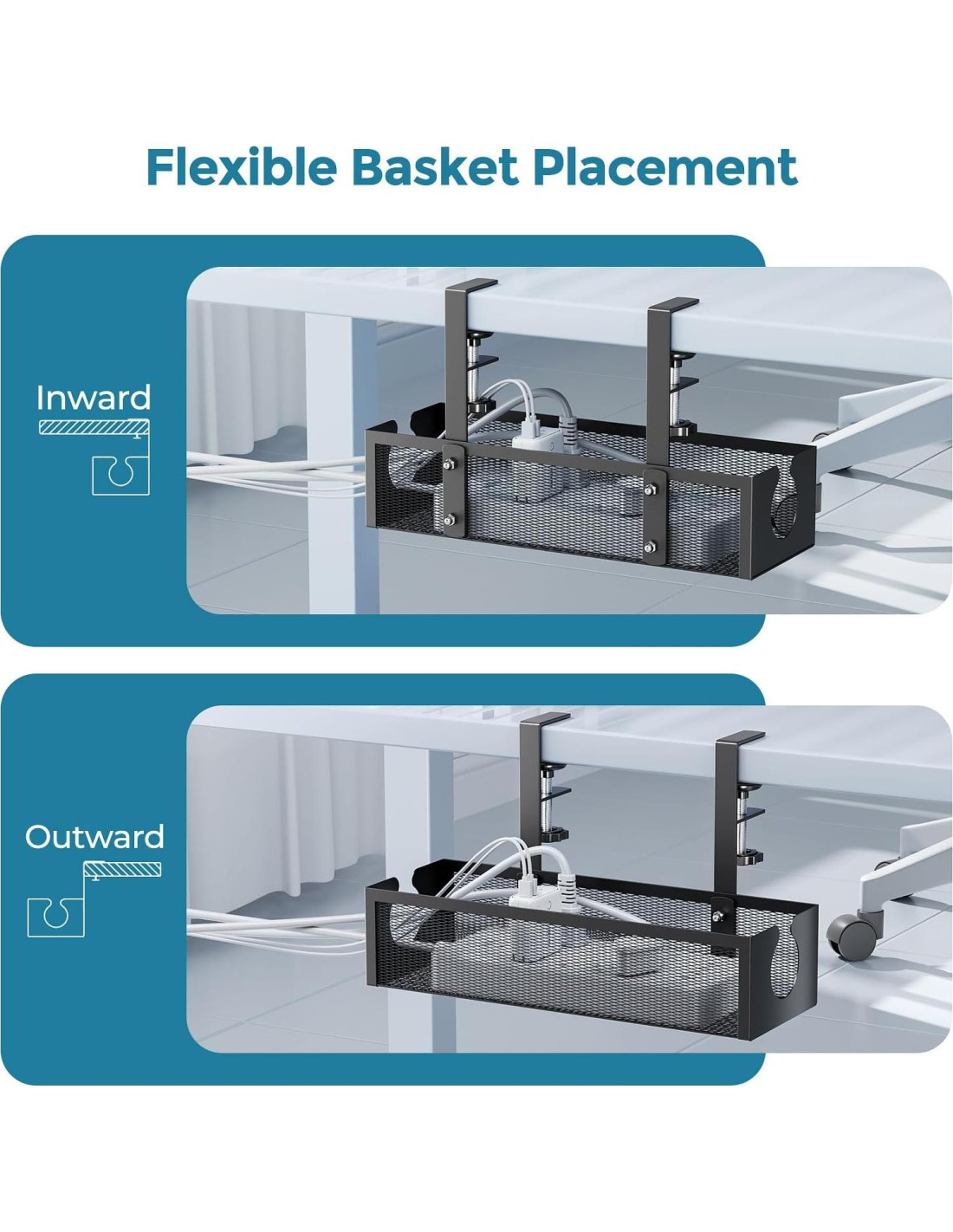 - Abrazadera de doble cara para uso flexible Nuestra bandeja de gestión de cables para debajo del escritorio admite abrazado tanto hacia adentro como hacia afuera, permitiendo un enrutamiento y organización versátiles de cables para regletas, cables o pequeños accesorios.