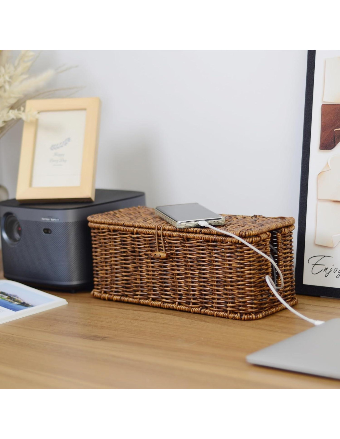 - Material Seguro y Sistema de Ventilación: La caja de gestión de cables Brownlily asegura un grosor resistente con material de ratan sintético seguro. El soporte de cables transpirable previene eficazmente el sobrecalentamiento de la regleta debido a sus múltiples orificios de aire