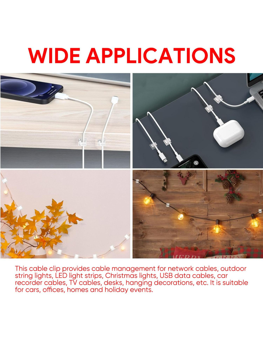 Puede ayudarte a gestionar el cableado incluso al aire libre. Los clips de cable facilitan la sujeción de múltiples cables que están desordenados; puede mantener tu escritorio limpio. Presenta un respaldo adhesivo 3M para un montaje fiable en superficies como madera, plástico, paredes, metal, vidrio y cerámica sin dañarlas; los clips de cable se utilizan ampliamente en hogares, oficinas y automóviles.