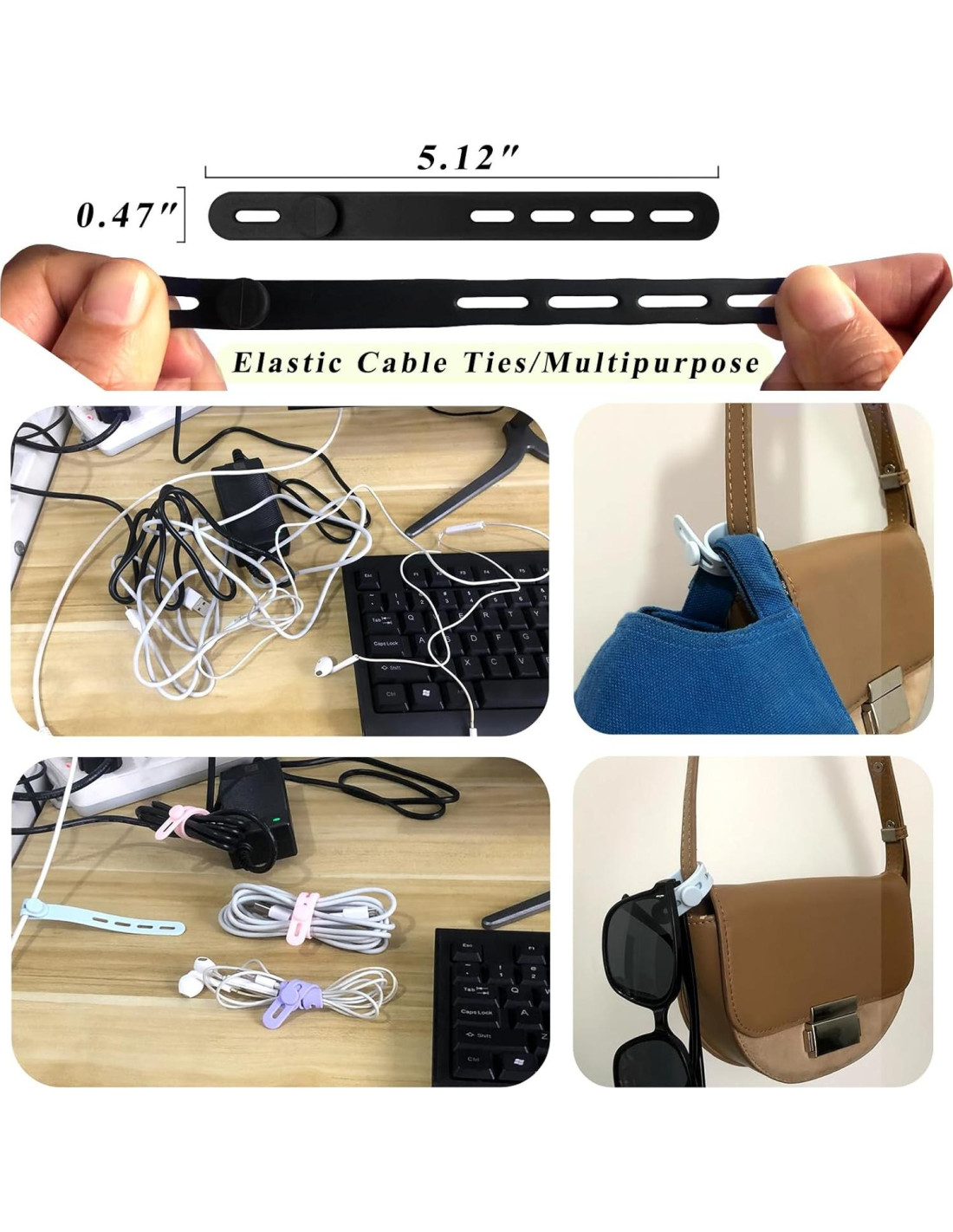 - [Tamaño y Diseño Eficiente] Nuestras bridas de cable de silicona miden aproximadamente 13cm (5.12 pulgadas) de largo y 1.2cm (0.47 pulgadas) de ancho, compactas y fáciles de llevar, úselas en cualquier momento y lugar. La parte inferior de las bridas tiene 4 botones a presión con diferentes engranajes, puede ajustar las longitudes según el tamaño de sus artículos.