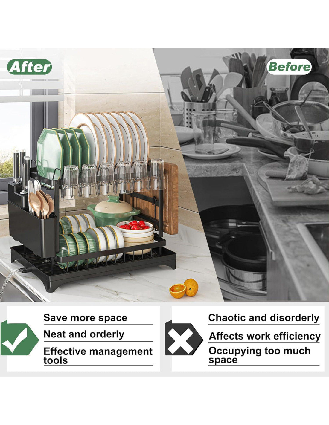 - ALMACENAMIENTO DE ESPACIO MÁS GRANDE: Nuestro escurridor de platos mide 30 cm de profundidad * 42 cm de ancho * 29 cm de altura con soporte para platos, soporte para tazones, soporte para tazas y almacenamiento de utensilios y tabla de cortar para 11 platos, 22 tazones, 6 tazas,