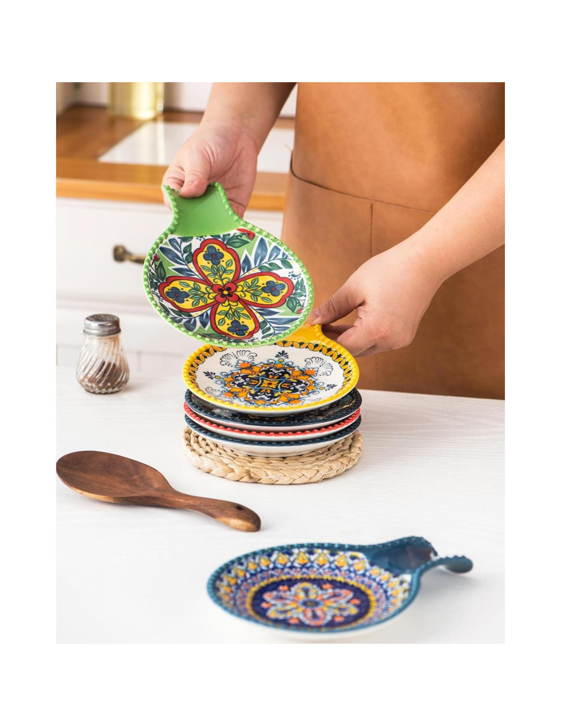 - COLOR VIBRANTE Y PATRONES ESPECIALES - Diseñado por arte pintado a mano con colores brillantes y motivos intrincados, este colorido soporte de cuchara de cocina es perfecto para cualquier hogar con pasión por la cocina. Con altas temperaturas para el color y el esmalte, las cerámicas no se desvanecen. El diseño geométrico de estos soportes de cuchara no solo mantiene su cocina ordenada y organizada, sino que también añade color y estilo a su mesa y cocina.