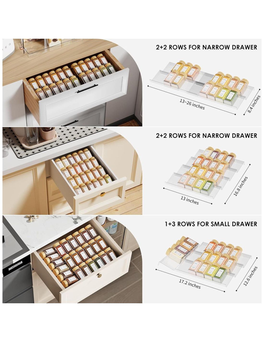 - Bandeja de Especias de Gran Capacidad: La bandeja de especias es adecuada para cajones con una profundidad de al menos 8.25 cm (por favor mide el tamaño de la profundidad del cajón antes de realizar un pedido), y puede contener hasta 60 tarros de especias estándar de 113 gramos.