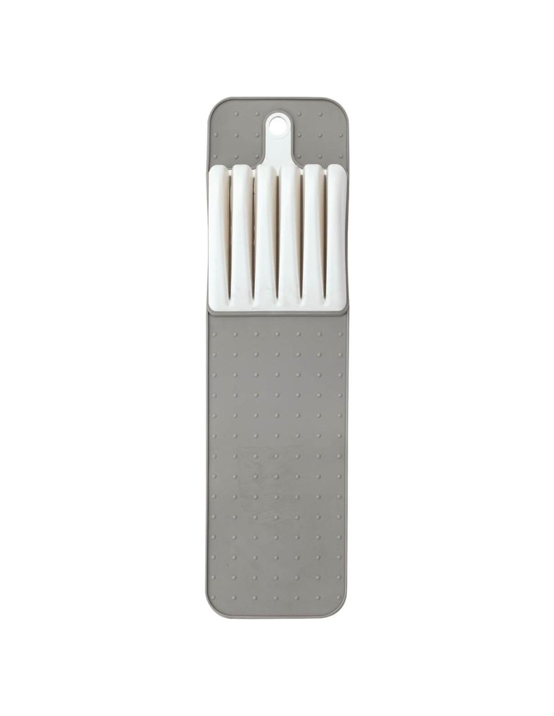 Almacena y protege los utensilios de corte en el cajón con esta alfombrilla de almacenamiento ranurada que está diseñada para mantener las cuchillas seguras, afiladas y en su lugar de forma segura, manteniéndote a salvo de cortes y rasguños accidentales cuando las saques. Diseñada en plástico duradero y libre de BPA y silicona suave, la alfombrilla organizadora de cocina cuenta con 5 ranuras para organizar y almacenar de forma segura cuchillos de todos los tamaños. Compra múltiples alfombrillas para cajones para llenar un cajón completo y proteger toda tu colección de utensilios de corte sin desperdiciar valioso espacio en la encimera con un bloque de cuchillos voluminoso. La Alfombrilla de Almacenamiento para Cuchillos en Cajón se lava a mano para una fácil limpieza y ofrece almacenamiento que ahorra espacio para cocinas más pequeñas, apartamentos, residencias para personas mayores, cabañas y campistas. La alfombrilla organizadora de cajón mide 36.83 cm de Largo x 10.16 cm de Alto. Cuchillos no incluidos. Por Chef's Pride.