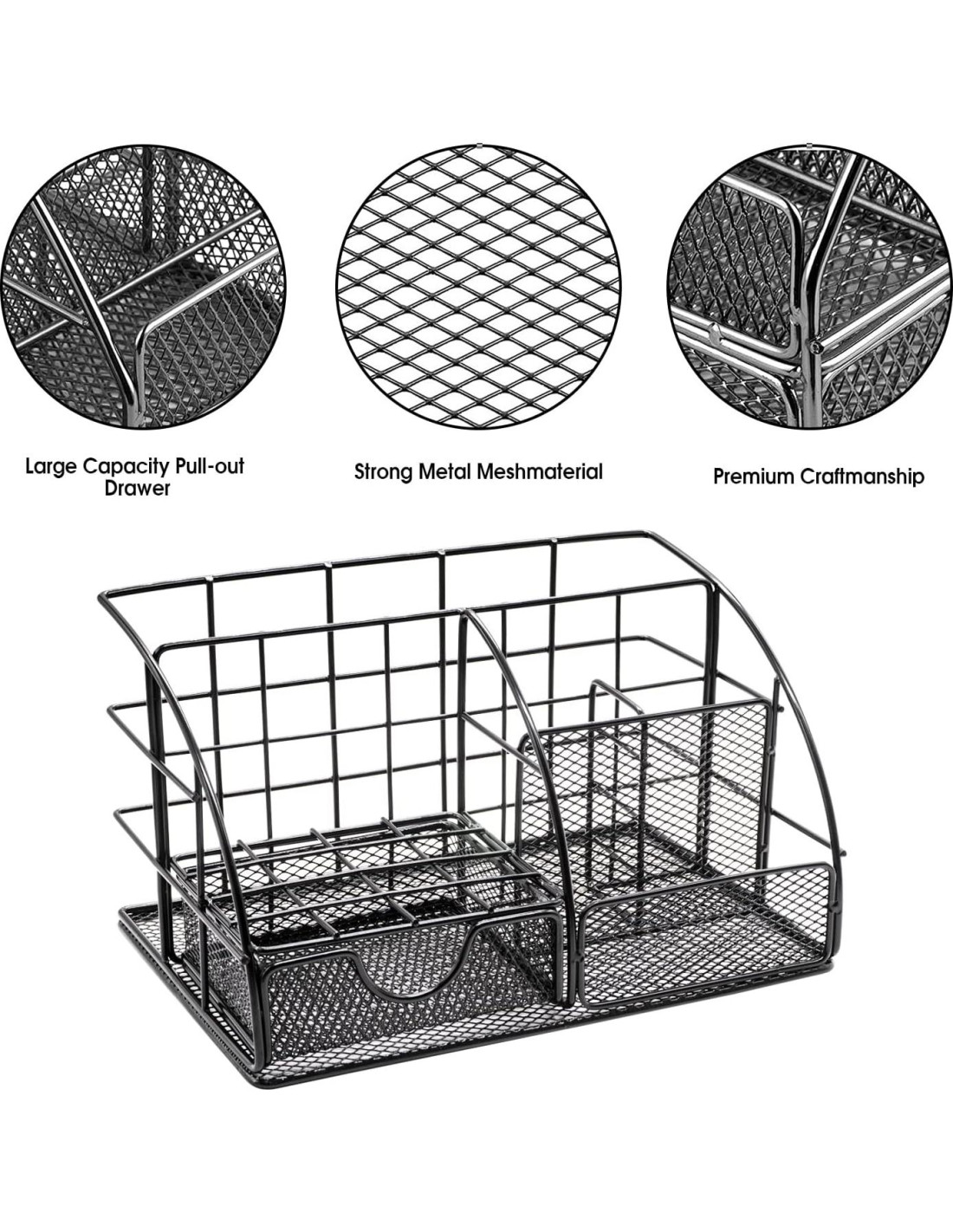 - [Organizadores de Escritorio Elegantes] Nuestro lindo y estiloso organizador de escritorio cuenta con 5 compartimentos separados y 1 mini cajón deslizante. El organizador de escritorio tiene un acabado de pintura en polvo y tecnología de electrochapado, resistente al desgaste, anti-oxidación, duradero y no se desvanece. Los bordes redondeados de metal añaden atractivo visual y protegen tu escritorio.