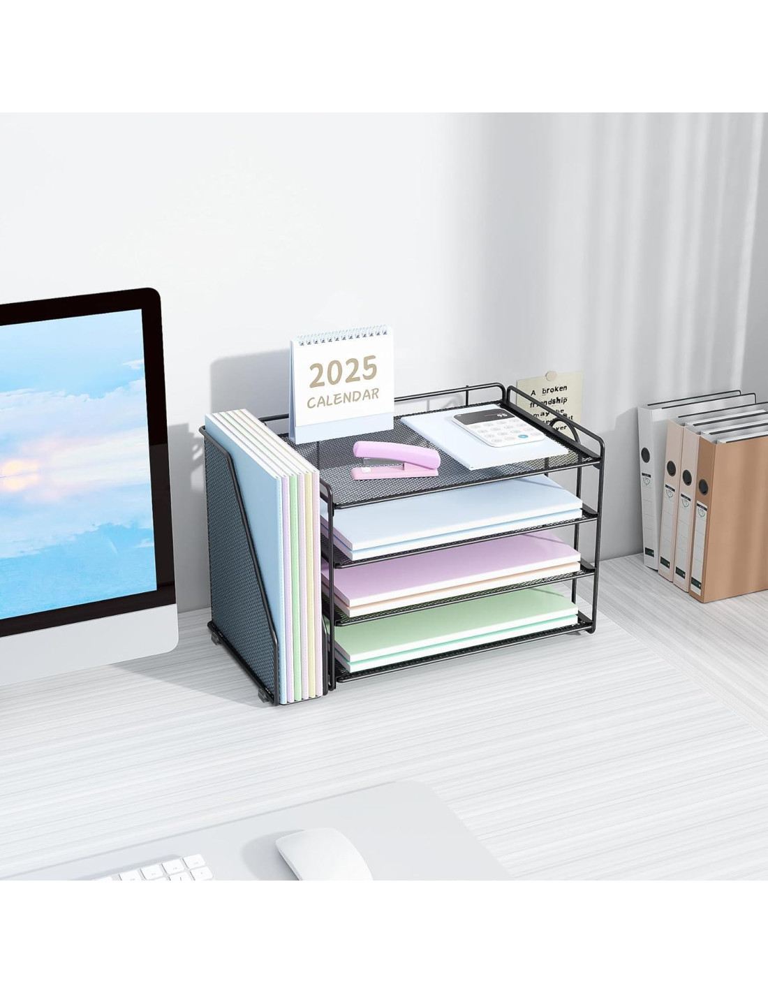 - Ahorra espacio en el escritorio: El organizador de escritorio de oficina te proporciona 4 bandejas de papel y un organizador de archivos vertical, brindando amplio espacio para tu escritorio y ayudando a mantenerlo organizado y libre de desorden.