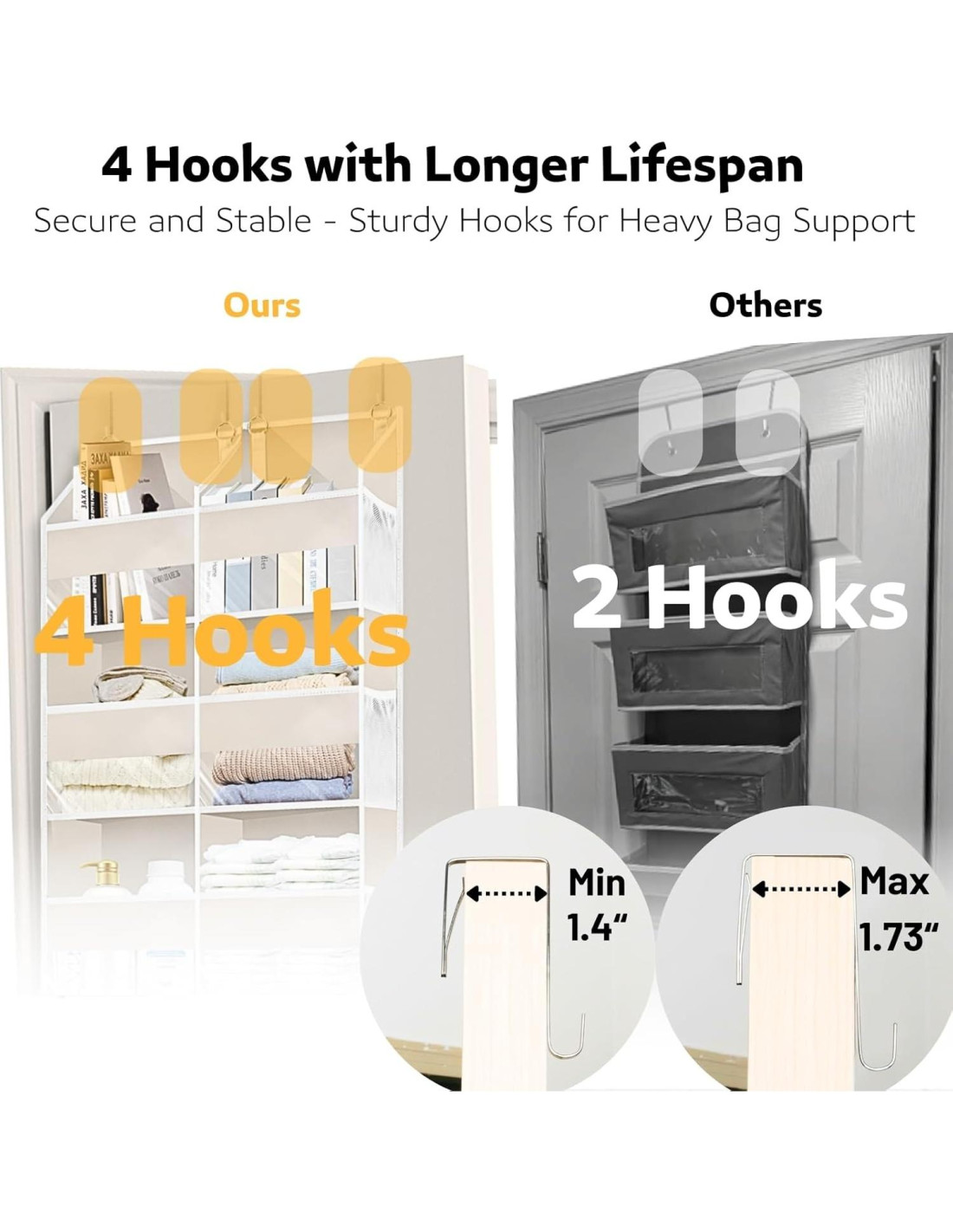- [4 Ganchos de Soporte y 10 Bolsillos de Malla Lateral, Confiable y Conveniente] 4 ganchos brindan soporte confiable a los organizadores y almacenamiento de puertas en lugar de los tradicionales 2 ganchos. Puedes colgarlo en todas las puertas gruesas regulares (1.4"~1.73"). También tiene 10 bolsillos de malla en el lado para pequeños artículos como llaves y peines o chanclas y cosas de uso frecuente, manteniendo tus esenciales al alcance de la mano.