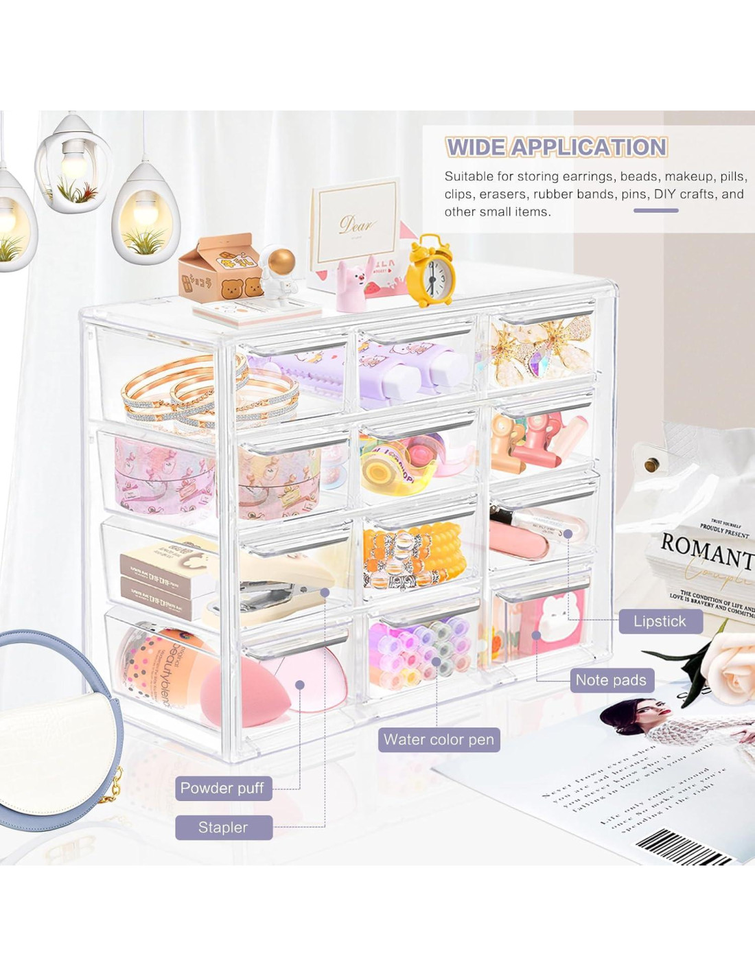 - Caja de Almacenamiento Mini Versátil: Diseñada con 12 cajones separados a prueba de polvo, adecuada para almacenar pequeños artículos de papelería y accesorios, aretes, cuentas, suministros de oficina, papelería de regreso a la escuela, suministros de manualidades, joyería, bandas elásticas, clips para el cabello, cosméticos, cinta y más para mantener tu espacio de trabajo ordenado y decir adiós a una vida desorganizada y desordenada.