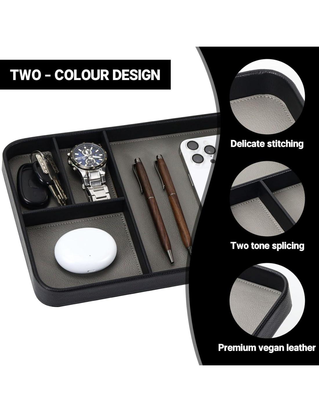 - PU Premium: Bandeja organizadora hecha de cuero sintético de alta calidad (resistente al agua y fácil de limpiar con un paño húmedo) con un interior suave y antiarañazos color crema. Previene rasguños en teléfonos inteligentes, relojes o joyas mientras mantiene un aspecto elegante y lujoso, perfecto para proteger artículos delicados.