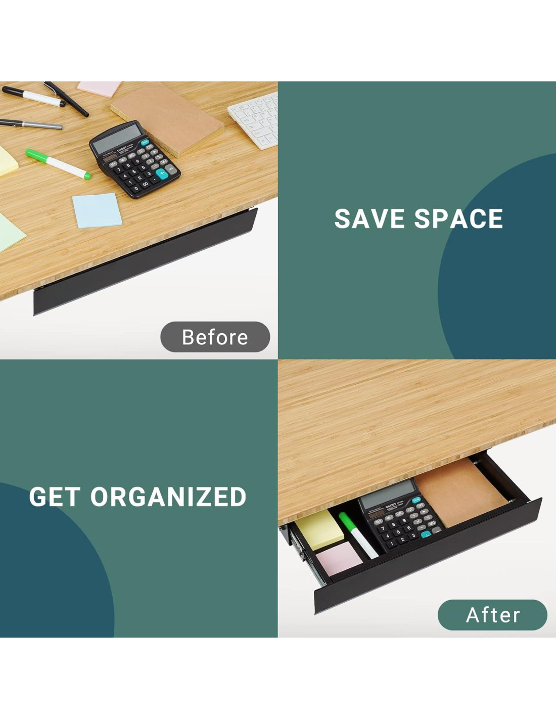 - Solución Perfecta para Ahorrar Espacio: Una solución ideal para mantener tu escritorio organizado y ordenado. Presenta dimensiones externas de 23.9 cm W x 45.0 cm D x 7.1 cm H y dimensiones internas de 22.0 cm W x 38.1 cm D x 5.1 cm H. Este cajón bajo escritorio puede soportar hasta 5 kg y se abre/cierra suavemente con deslizadores de rodamiento. Haz que tu espacio de trabajo esté limpio y ordenado para mejorar la eficiencia laboral y eliminar el estrés.