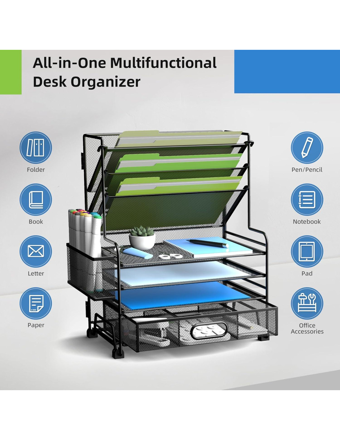 - [Uso Versátil - Organiza Todo] Sostiene papeles A4, cuadernos, archivos y suministros de oficina (bolígrafos, grapadoras, notas adhesivas). Ideal para maestros, estudiantes, profesionales y oficinas en casa. Ayuda a reducir el desorden y aumentar la productividad manteniendo todo al alcance.