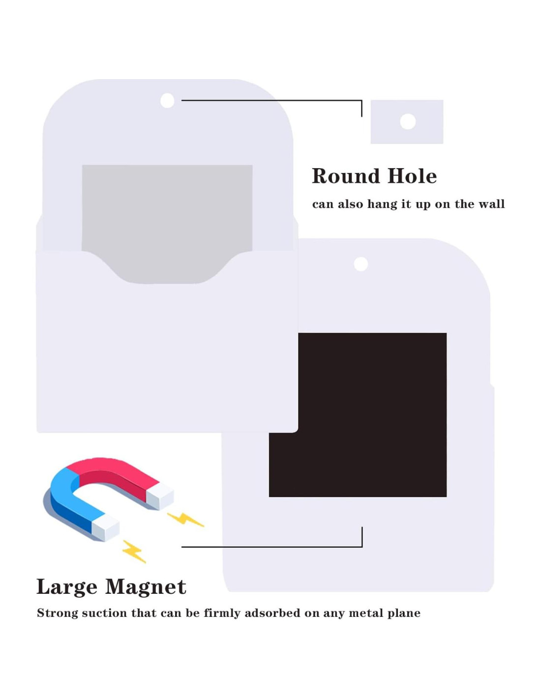 - 2 Tipos de Uso: El gran imán en la parte posterior crea una fuerte succión que puede adherirse firmemente a cualquier superficie metálica sin deslizarse ni caerse. Además, la parte superior del soporte de archivo magnético blanco está diseñada con un agujero redondo para que también puedas colgarlo en la pared. En esta carpeta magnética, puedes poner y revisar archivos fácilmente.