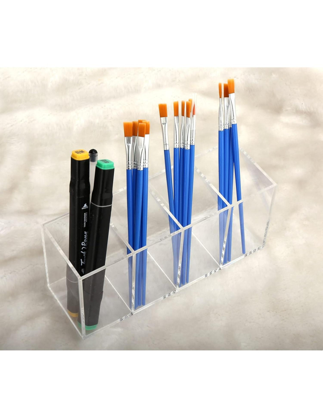 - Diseño Transparente Genial: El soporte de lápices acrílico de 4 compartimentos tiene una excelente transparencia, la transmitancia de luz es superior al 98%. El cuerpo transparente le permite ver fácilmente los artículos dentro del soporte de lápices acrílico desde diferentes ángulos.