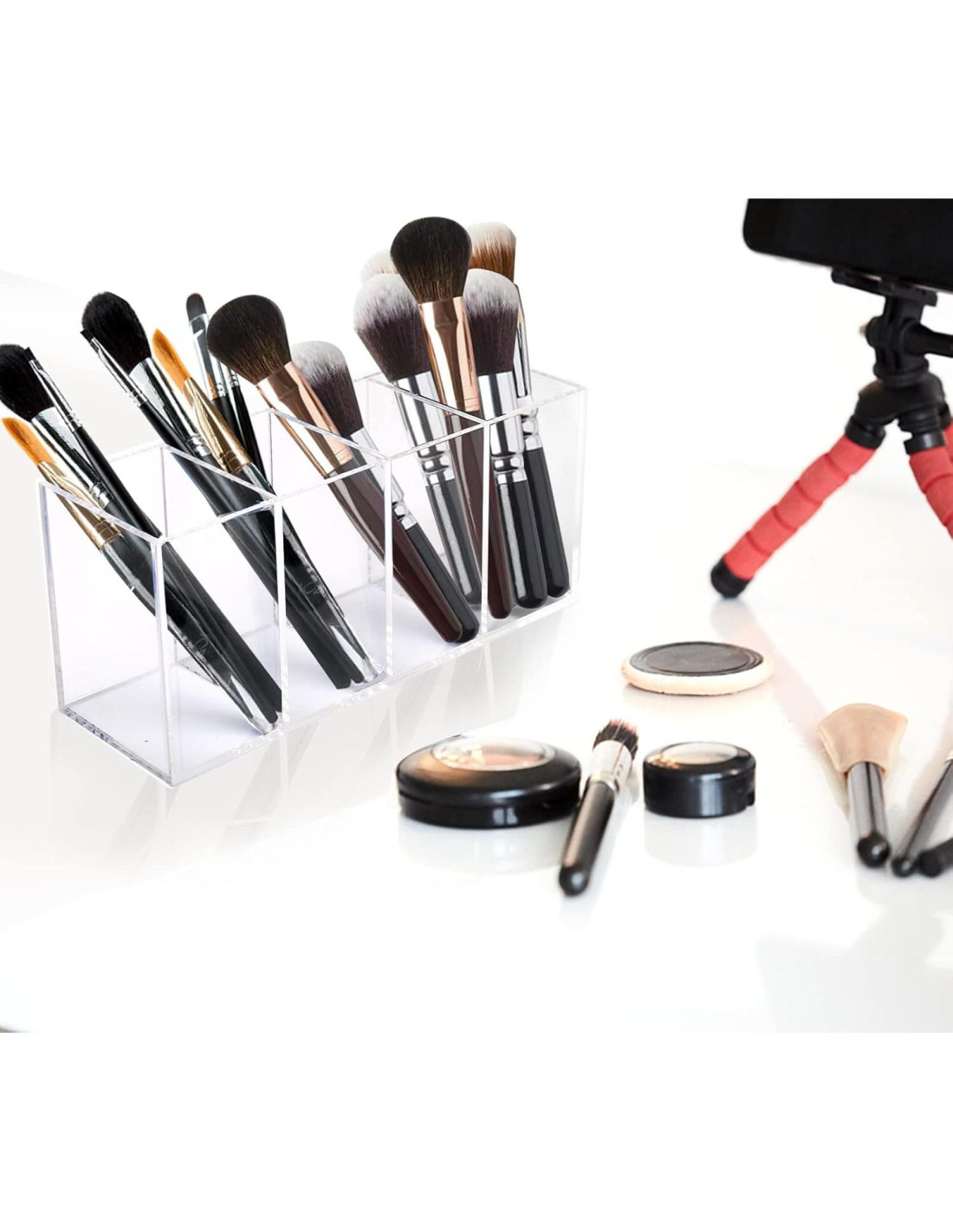 - Lista de Paquete: Contiene organizador de taza para brochas de maquillaje acrílico de 4 compartimentos + paño de limpieza