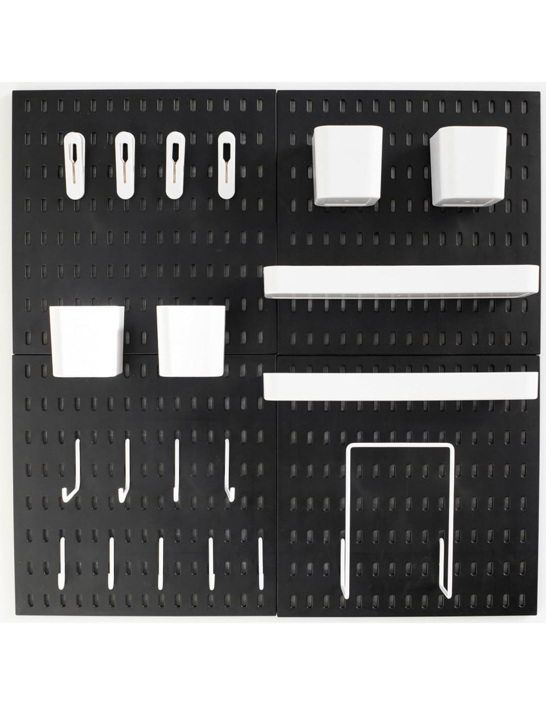 - Inclusiones del kit: El Kit de Combinación de Tablero de Clavos incluye 8 paneles de tablero de clavos (cada uno de 27.94 cm x 27.94 cm), 4 contenedores (8.89 cm x 7.62 cm x 7.87 cm), 4 estantes (27.94 cm x 8.89 cm x 3.05 cm), 2 soportes para cartas (18.54 cm x 12.45 cm x 5.58 cm), 4 ganchos largos (6.1 cm x 9.4 cm), 10 ganchos (2.54 cm x 6.1 cm) y 8 clips (2.03 cm x 7.87 cm)