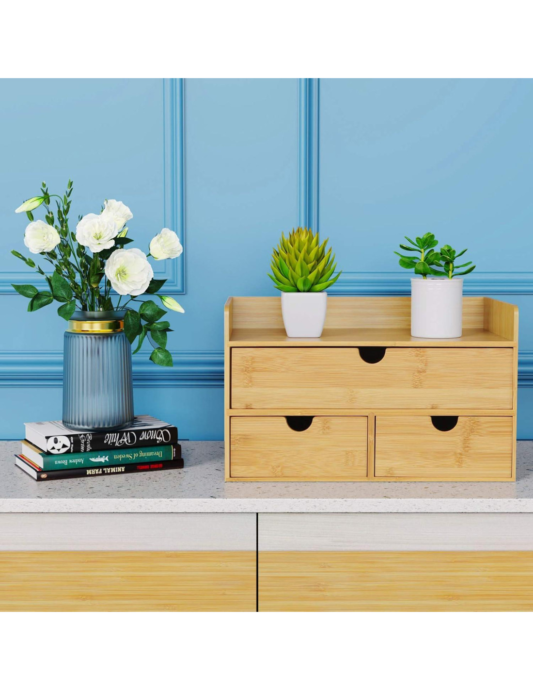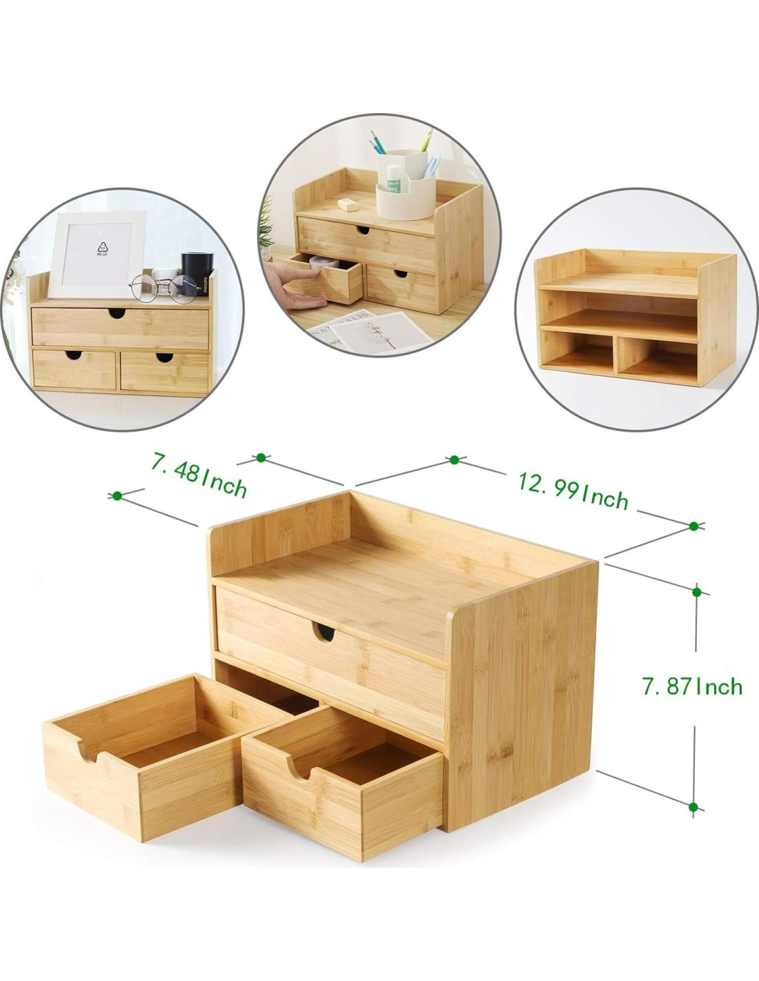 El bambú es uno de los materiales más versátiles, renovables y sostenibles disponibles en el mundo. Desde ser una hierba hasta convertirse en un producto, el bambú ha recorrido un largo camino. Su material versátil se puede utilizar para crear prácticamente cualquier cosa, como utensilios de cocina de bambú, vajilla, etc. Varios estilos para seleccionar. Elija el tamaño apropiado según sus necesidades y el lugar donde se coloque. Cada organizador de cajones se adapta al estilo de su escritorio, intercalado en el armario, mesita de noche, etc. Elimina el desorden, libera espacio en el gabinete. Organiza y almacena una amplia variedad de artículos, incluidos suministros de oficina, artículos de tocador, etc. Construido con el resistente bambú natural. La superficie del bambú está recubierta con barniz NC, que es inofensivo para el cuerpo humano. Y la superficie es lo suficientemente suave como para abrir los cajones fácilmente. No solo puede mantener su escritorio ordenado y limpio, sino que también puede decorar con este único organizador de cajones decorativo. 2 Cajones, 3 Cajones, 3 Cajones con cajón grande, 4 Cajones. Tamaño de los cuatro estilos anteriores: 32.92 cm x 18.99 cm x 16 cm (L*W*H). 3 Cajones con estante. Tamaño del estilo anterior: 32.92 cm x 18.99 cm x 19.99 cm (L*W*H).