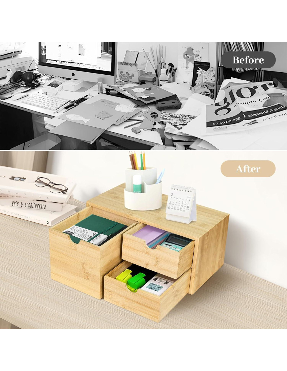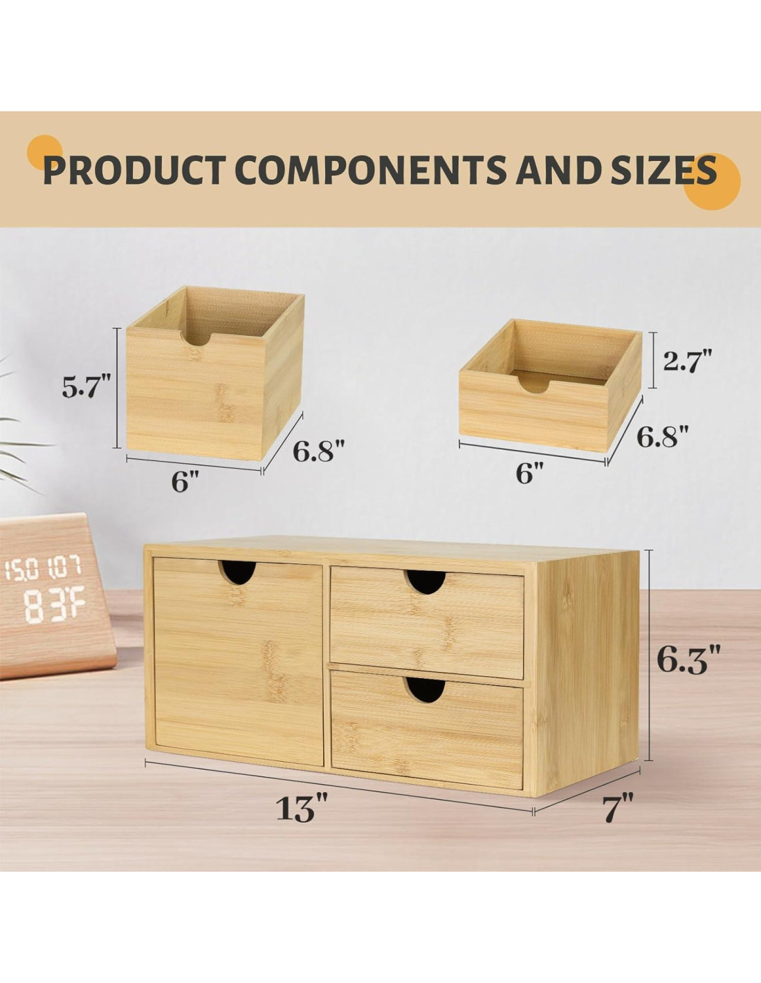 - [CAJÓN MULTIUSO]: Como un organizador de escritorio de bambú práctico y hermoso, también puede ser parte de tu decoración del hogar al organizar y almacenar varios artículos. Adecuado para espacios pequeños, oficinas, salas de estudio, cafeterías y más. Mantén tu escritorio organizado y regala a tus amigos o colegas un organizador de almacenamiento de encimera imprescindible.