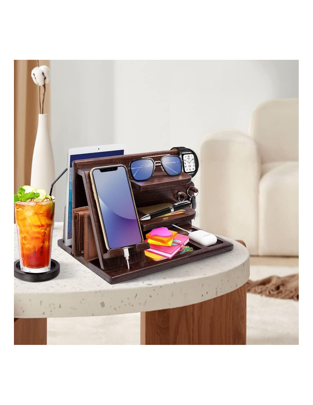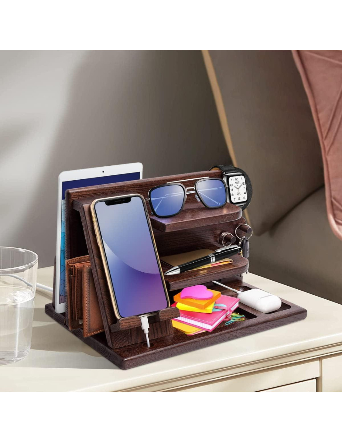 - Nuestro organizador de mesa de noche es la manera perfecta de mantener tu teléfono y otros esenciales organizados. Nunca pierdas tus pertenencias personales nuevamente con esta estación de acoplamiento de madera para hombres. Ya sea en casa o en la oficina, mantén todos tus esenciales diarios ordenados y elegantemente organizados