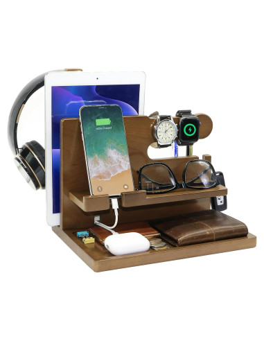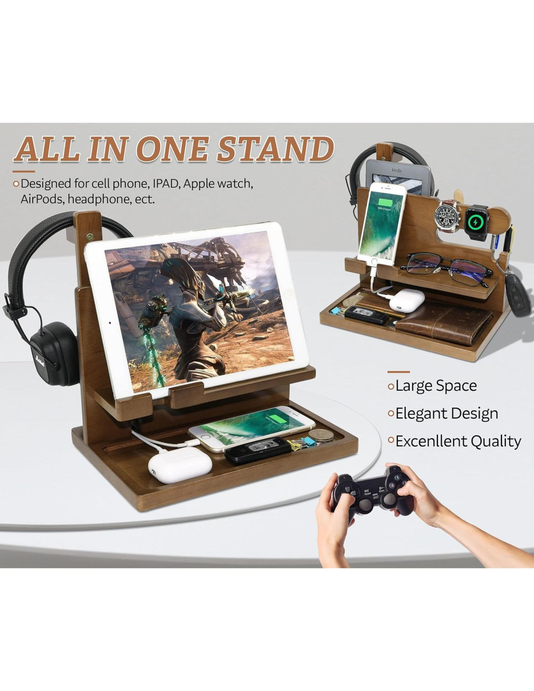 - Diseño Todo en Uno - Fácil de Montar: Compatible con todo tipo de smartphones. Ayuda a organizar tu espacio de escritorio y mantener tus accesorios a mano. El soporte también tiene compartimentos para carteras, documentos, gafas, relojes, rastreadores de fitness, pulseras, llaves, material de oficina, etc. Los pasos de ensamblaje están adjuntos en la parte posterior de la caja. Puedes ensamblar tu organizador de mesita de noche de madera para hombres de acuerdo con las instrucciones.