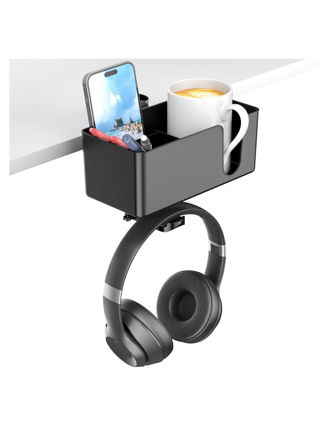 - Diseño Exclusivo 4 en 1 - El Organizador de Escritorio 4 en 1 no solo puede colocar sus auriculares de juego o audio, sino que también está equipado con una caja de almacenamiento de escritorio, que puede contener una taza, teléfono móvil, cuaderno y lápiz, dependiendo de sus necesidades. Puede poner cualquier otra necesidad diaria en el organizador.