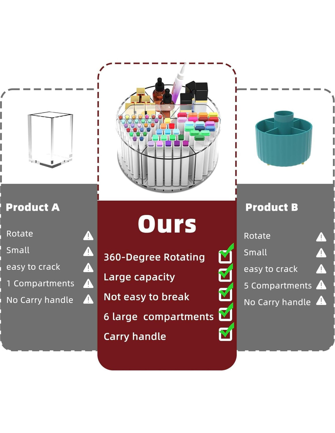 - Organizador acrílico multipropósito Absonic - El organizador de marcadores para niños transparente tiene un asa de transporte para fácil traslado de una habitación a otra. El organizador de crayones rotatorio de 360 grados facilita la organización y el acceso a los suministros en tu escritorio. Hay 6 compartimentos de almacenamiento grandes, resistentes y fuertes, para que puedas organizar fácilmente tus pinceles, lápices, lápices de colores, tijeras y crayones. Mantén todo ordenado y limpio en tu escritorio con nuestro soporte para lápices acrílico.