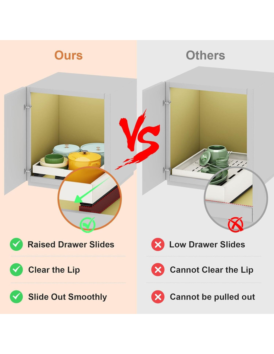- COMPATIBLE CON TODOS LOS TIPOS DE GABINETES: Ya sea que tus gabinetes sean enmarcados o sin marco, nuestros cajones deslizables estables son un ajuste ideal. Nuestro organizador de gabinete deslizante viene con tres espaciadores para elevar el cajón y los rieles, asegurando un deslizamiento suave incluso si tus gabinetes tienen labios. Si tus gabinetes son sin labio, puedes optar por no usar los espaciadores.
